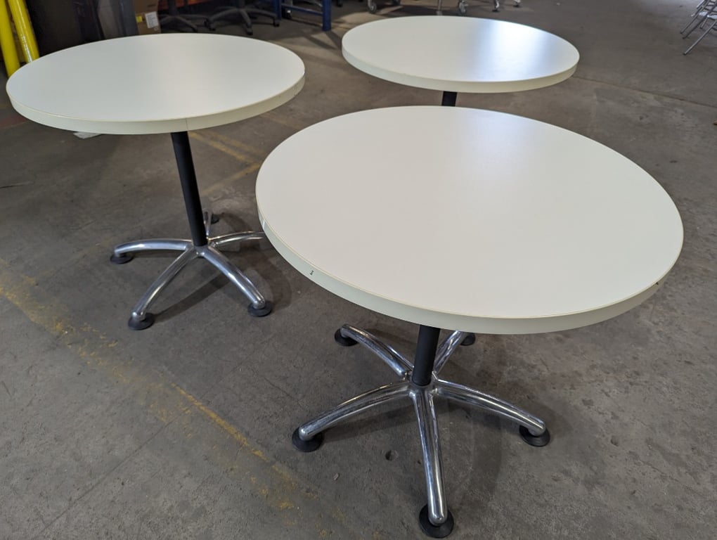 3x Round White Pedestal tables. Note: signs of wear & damages Note, sizes may vary, Consigned in bulk Sold as lot