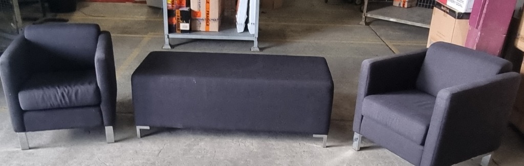 Office furniture, upholstered black, 2 x 1 single arm chairs and 1 x long ottoman with metal legs. Dims: (chairs) 60 x 100 x 100cm, (ottoman) 120 x 80 x 90cm Sold as lot Note: may have wear and tear.