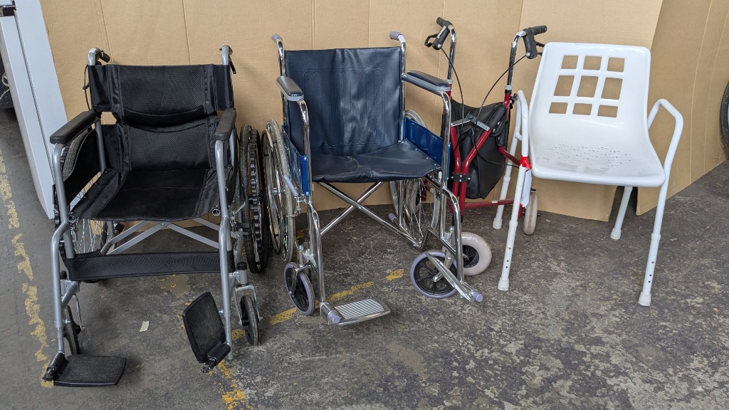 Mobility equipment, including 2 x wheelchairs 1 x walker and 1 x shower chair Sold as lot