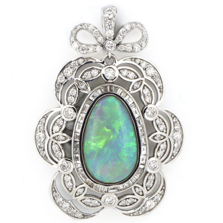 14K WHITE GOLD, 4.27CT AUSTRALIAN LIGHTNING RIDGE OPAL AND DIAMOND, DECORATIVE PENDANT. The Centre Features, One Cabochon Cut, Green, Blue, Violet Colour Play, Australian Lightning Ridge Opal (4.27Ct, Moderate Grazing), Bezel Set. Surrounding The Centre Are, 132 Baguette/Round Brilliant Cut, Diamonds (1.37Ct Tdw, G-H Colour, Si1-Si2 Clarity), Channel/Micro-Bead Set. Total Item Weight Is 7.64Grams. Valuations Provided by an Independent Third-Party Professional Not Directly Associated With Lloyds Auctions at AUD $$44,000.00This valuation has been conducted by an independent third-party professional. The valuation amount is an assessment by the issuing valuer and does not reflect the auction value of the item. Any inquiries regarding the valuation should be directed to the issuing valuer (refer to contact details on the certificate), as Lloyds Auctions has no affiliation or influence over the valuation, the valuer, or the stated amount. Condition: Good - Refer Images 0645830+8001