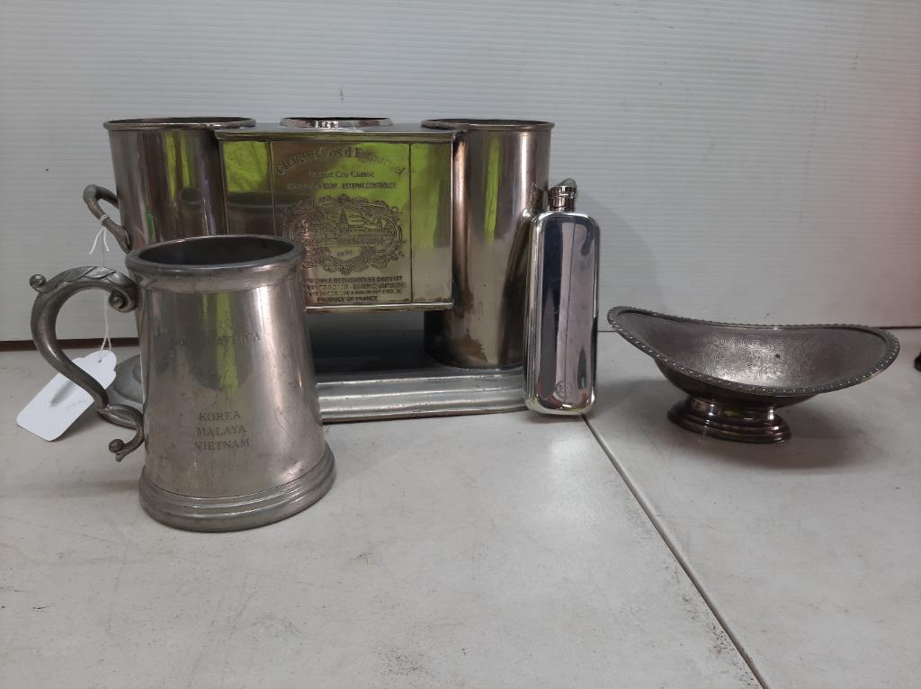 1x vintage two bottle wine cooler white metal marked "Chenas contemporary 1966", 1x seltic pewtar hip flask, 1 x Pewtar Australian tankard mug, 1x Parker-Ellis trinket bowl made in England