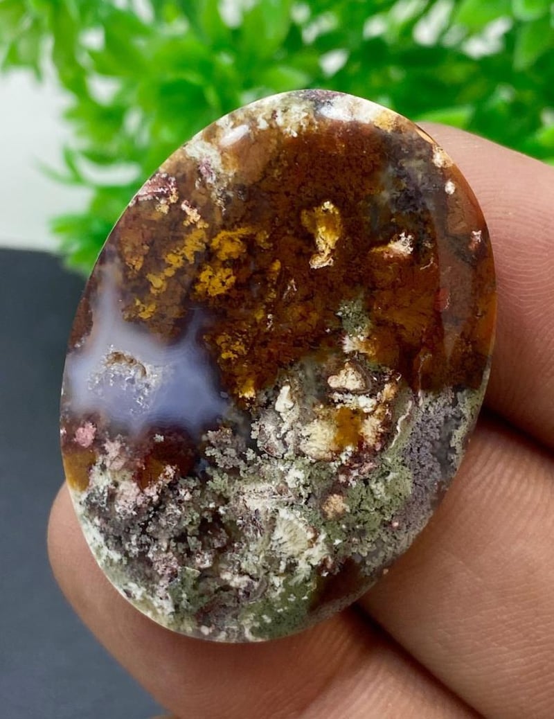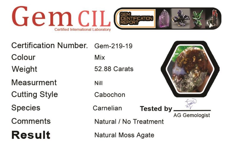 52.88 CARATS NATURAL MOSS AGATE 52.88 Carats Natural Moss AgateStone = Moss AgateWeight = 52.88 Carats Treatment = No Treatment (Natural)Cut = Cabochon Quantity = 1Note = Gem Cil, Certified, Condition: Good645399+19