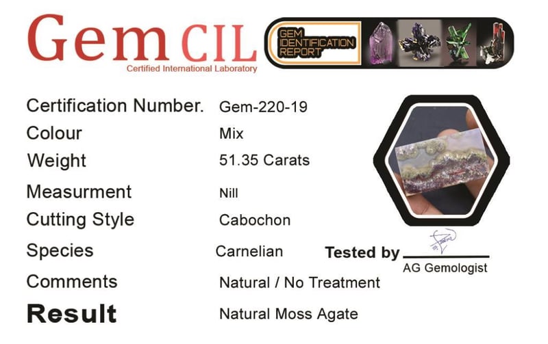 51.35 CARATS NATURAL MOSS AGATE 51.35 Carats Natural Moss AgateStone = Moss AgateWeight = 51.35 Carats Treatment = No Treatment (Natural)Cut = Cabochon Quantity = 1Note = Gem Cil, Certified, Condition: Good 0+69