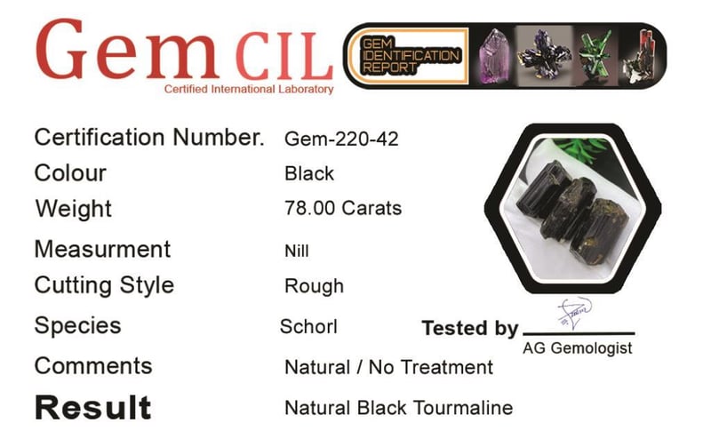78.00 CARATS NATURALLY TERMINATED BLACK TOURMALINE SPECIMEN 78.00 Carats Naturally Terminated Black Tourmaline SpecimenStone = Natural Black TourmalineWeight = 78.00 CaratsTreatment = Natural Colour = BlackNote = {Natural, Termination Is Collectable}, Gem Cil, Certified, Condition: Good 0+92