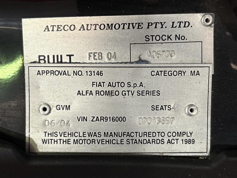 2004 Alfa Romeo GTV 1631 Twin Spark Year: 2004 Make: Alfa Romeo Model: GTV Series: 1631 Badge: Twin Spark Body: 2-Door Coupe Drive Type: Front wheel drive Odometer: Indicating 168,549 Kilometers Engine: 2.0 I4 Petrol Transmission: 5-Speed Manual Colour: Black Seats: 4 Description/extras: Air Conditioning, Power windows, SRS, Tinted windows, Leather interior, Central locking, CD player, Log books/Owners manual. Alfa Romeo GTV 2.0 JTS Facelift Vendor advises the vehicle has recently undergone extensive maintenance, including a timing belt replacement, new clutch and gearbox installation, replacement of shock absorbers and brakes, as well as repairs to the fuel system and body. Reported to be one of only three known examples in Western Australia. Price Guide - $12,000 - $18,000 (Based on Unmodified Vehicle) VIN: ZAR91600007013897 ENG No: 937A10003838619 Motor Dealer Licence # MD27332 #PCV (Key #PCLV1) Lloyds stock #1031374+1