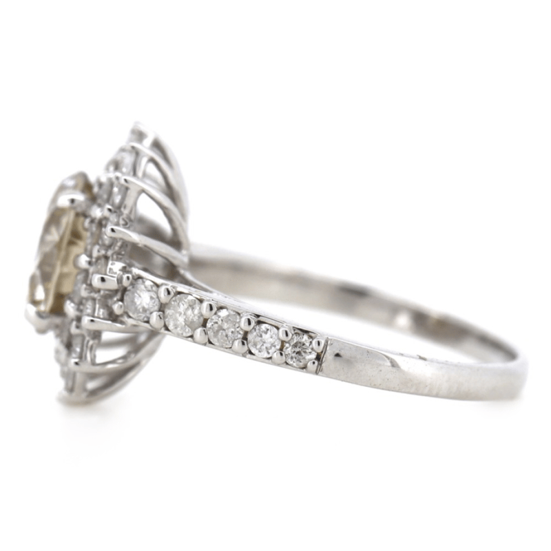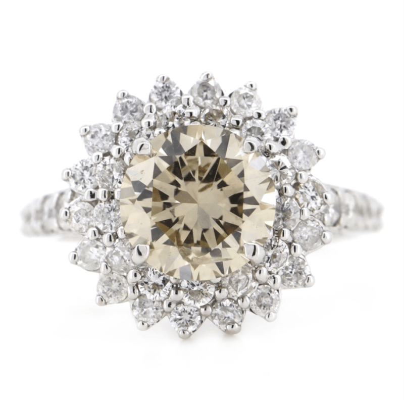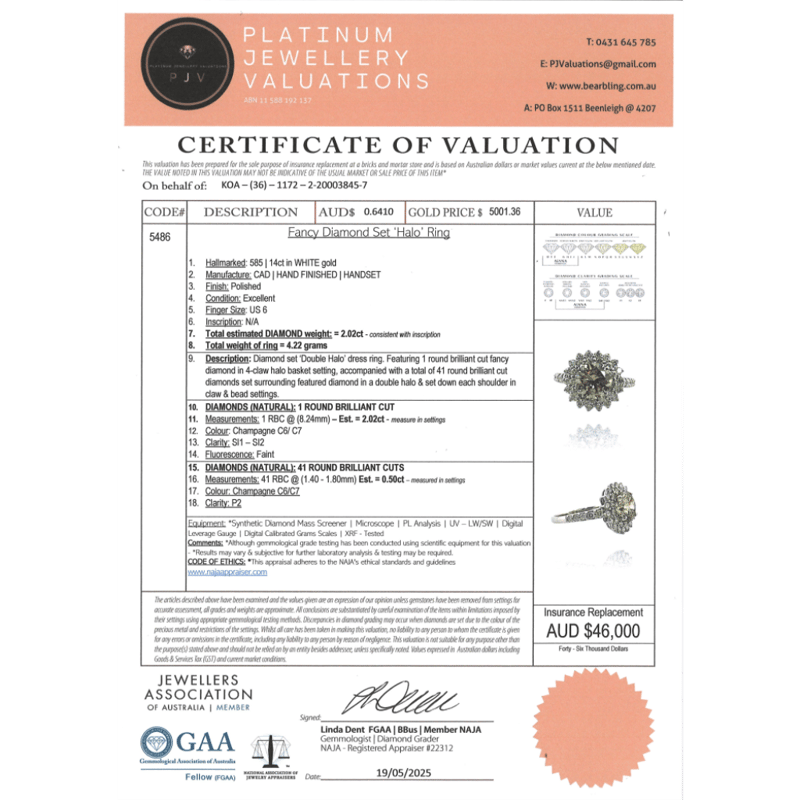 14K WHITE GOLD, CHAMPAGNE DIAMOND, HALO RING. The Centre Features, One Round Brilliant Cut, Champagne, Diamond (2.02Ct, C6-C7 Colour, Si1-Si2 Clarity), 4 Claw Set. Surrounding The Centre In A Double Halo And Decorating The Band Are, 41 Round Brilliant Cut, Champagne, Diamonds (0.50Ct Tdw, C6-C7 Colour, P2 Clarity), Claw/Bead Set. Ring Size L 1/2. 14K White Gold, Champagne Diamond, Halo Ring. The Centre Features, One Round Brilliant Cut, Champagne, Diamond (2.02Ct, C6-C7 Colour, Si1-Si2 Clarity), 4 Claw Set. Surrounding The Centre In A Double Halo And Decorating The Band Are, 41 Round Brilliant Cut, Champagne, Diamonds (0.50Ct Tdw, C6-C7 Colour, P2 Clarity), Claw/Bead Set. Ring Size L 1/2. Valuations Provided by an Independent Third-Party Professional Not Directly Associated With Lloyds Auctions at AUD $$46,000.00This valuation has been conducted by an independent third-party professional. The valuation amount is an assessment by the issuing valuer and does not reflect the auction value of the item. Any inquiries regarding the valuation should be directed to the issuing valuer (refer to contact details on the certificate), as Lloyds Auctions has no affiliation or influence over the valuation, the valuer, or the stated amount. Condition: Good - Refer Images 0645838+5353