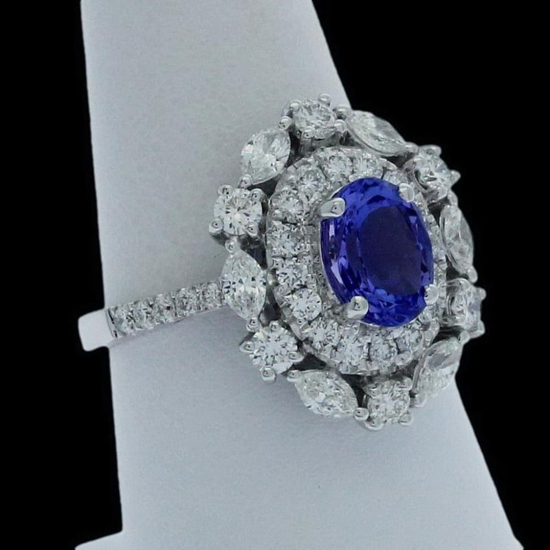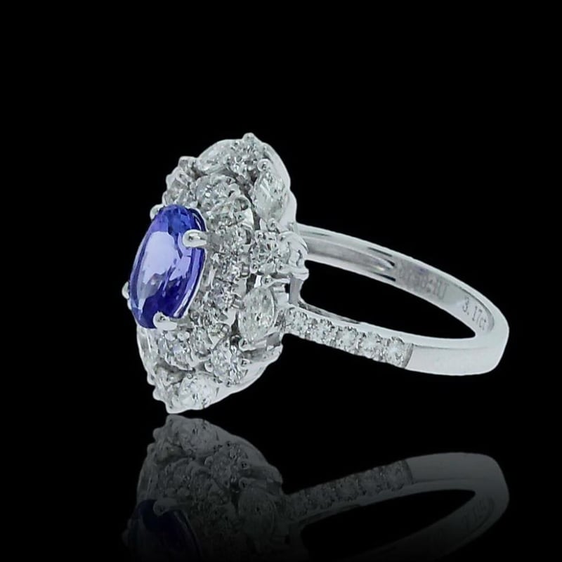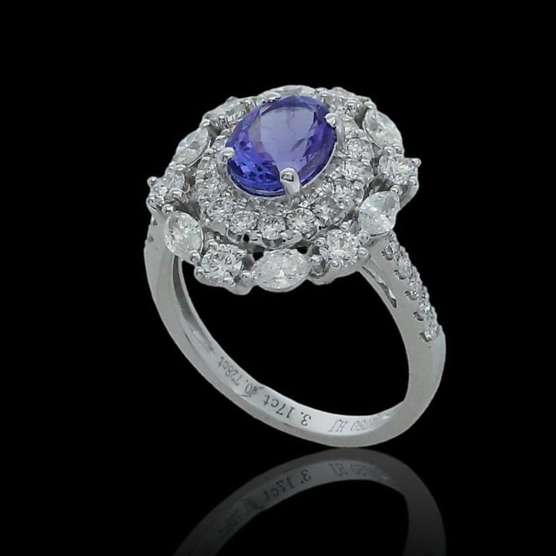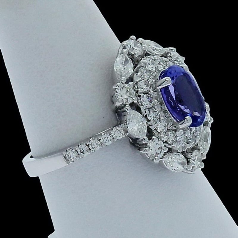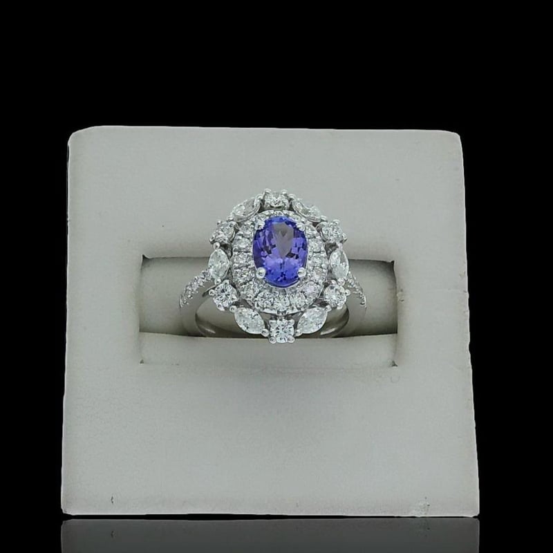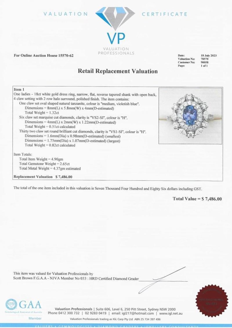 18CT WHITE GOLD TANZANITE AND DIAMOND DRESS RING 18Ct White Gold Tanzanite And Diamond Dress Ring, Narrow, Flat, Reverse Tapered Shank With Open Back, 4 Claw Setting With 2 Row Halo Surround, Polished Finish. The Item Contains: One Claw Set Oval Shaped Natural Tanzanite, Colour Is "Medium, Violetish Blue". Dimensions = 8Mm(L) X 5.8Mm(W) X 4Mm(D-Estimated) Total Weight = 1.32Ct Six Claw Set Marquise Cut Diamonds, Clarity Is "Vs2-Si", Colour Is "H". Dimensions = 4Mm(L) X 2Mm(W) X 1.22Mm(D-Estimated) Total Weight = 0.51Ct Calculated Thirty Two Claw Set Round Brilliant Cut Diamonds, Clarity Is "Vs1-Si", Colour Is "H". Dimensions = 1.6Mm(Dia) X 0.98Mm(D-Estimated) (Smallest) Dimensions = 1.75Mm(Dia) X 1.07Mm(D-Estimated) (Largest) Total Weight = 0.82Ct Calculated Item Totals: Total Item Weight = 4.90Gm Total Gemstone Weight = 2.65Ct Total Metal Weight = 4.37Gm Estimated Valuations Provided by an Independent Third-Party Professional Not Directly Associated With Lloyds Auctions at AUD $7486 This valuation has been conducted by an independent third-party professional. The valuation amount is an assessment by the issuing valuer and does not reflect the auction value of the item. Any inquiries regarding the valuation should be directed to the issuing valuer (refer to contact details on the certificate), as Lloyds Auctions has no affiliation or influence over the valuation, the valuer, or the stated amount. Condition: Good - Refer Images 0 160781+57