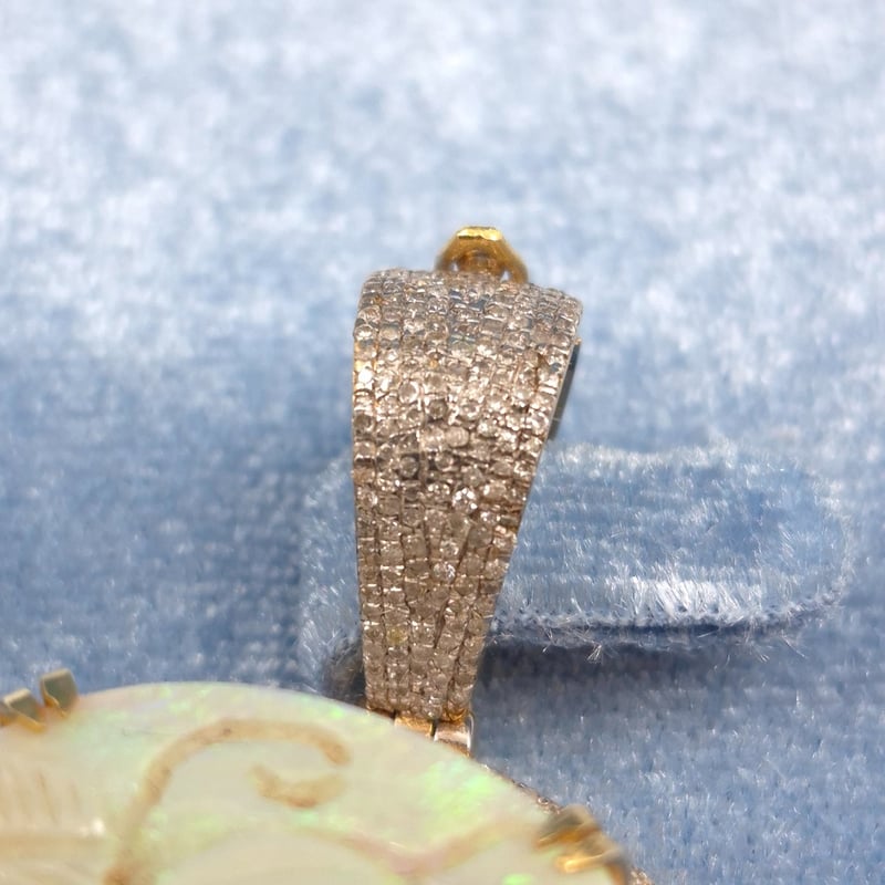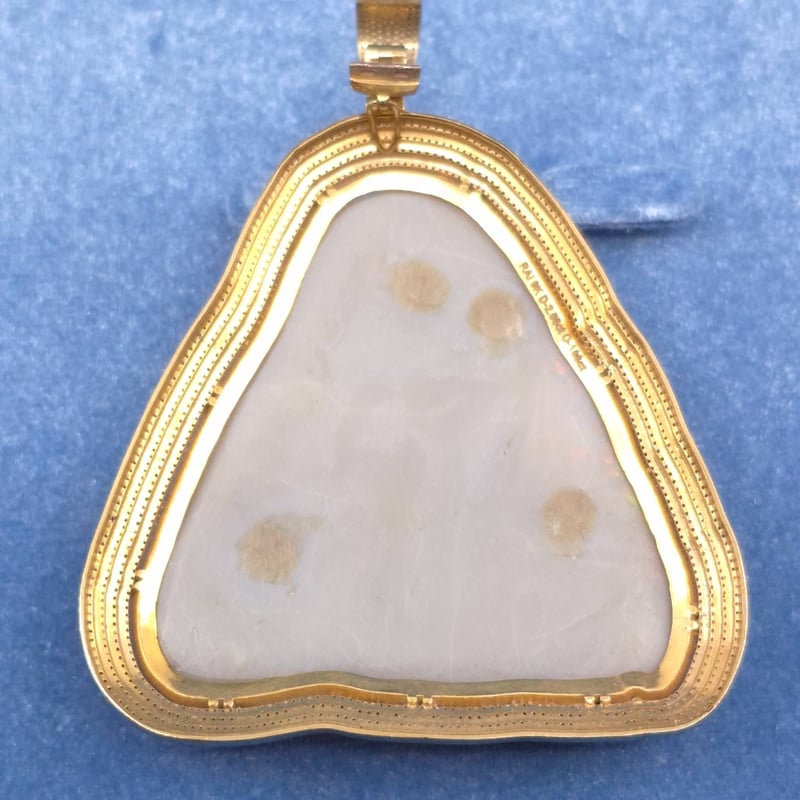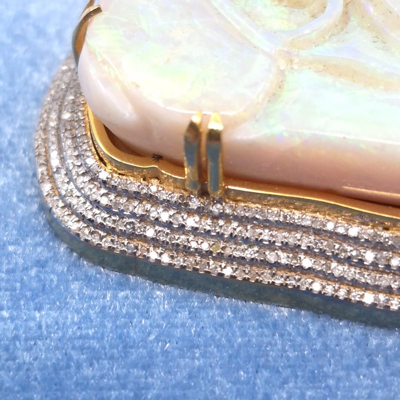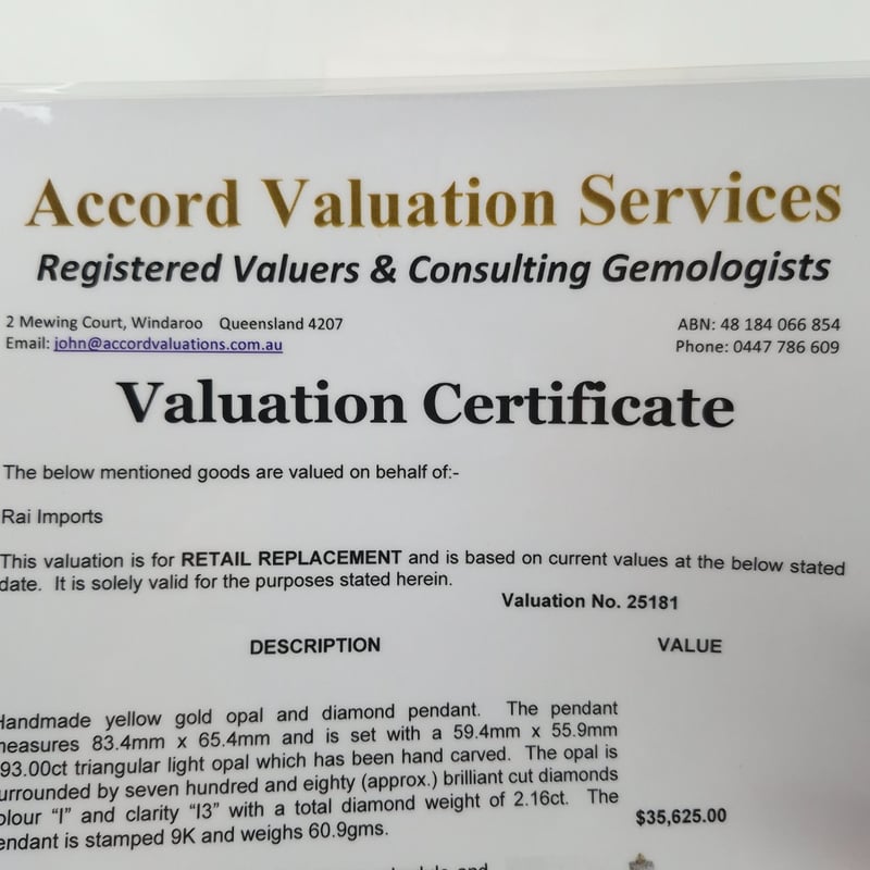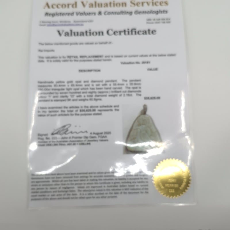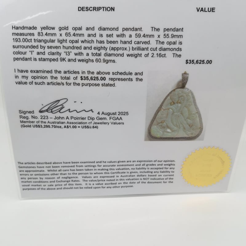 HANDCRAFTED 9CT YELLOW GOLD OPAL AND DIAMOND PENDANT. Measures 83.4Mm X 65.4Mm And Is Set With A 59.4Mm X 55.9Mm 193.00Ct Triangular Light Opal Which Has Been Hand Carved. The Opal Is Surrounded By Seven Hundred And Eighty (Approx.) Brilliant Cut Diamonds Colour "I" And Clarity "13" With A Total Diamond Weight Of 2.16Ct. The Pendant Is Stamped 9K And Weighs 60.9Gms. Total Item Weight: 60.90g Markings: 9K Condition: Good - Refer To Images This valuation has been conducted by an independent third-party professional. The valuation amount is an assessment by the issuing valuer and does not reflect the auction value of the item. Any inquiries regarding the valuation should be directed to the issuing valuer (refer to contact details on the certificate), as Lloyds Auctions has no affiliation or influence over the valuation, the valuer, or the stated amount. Insurance Replacement Valuation Amount: $35,625.00 586120+1