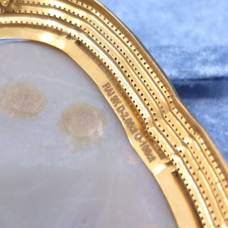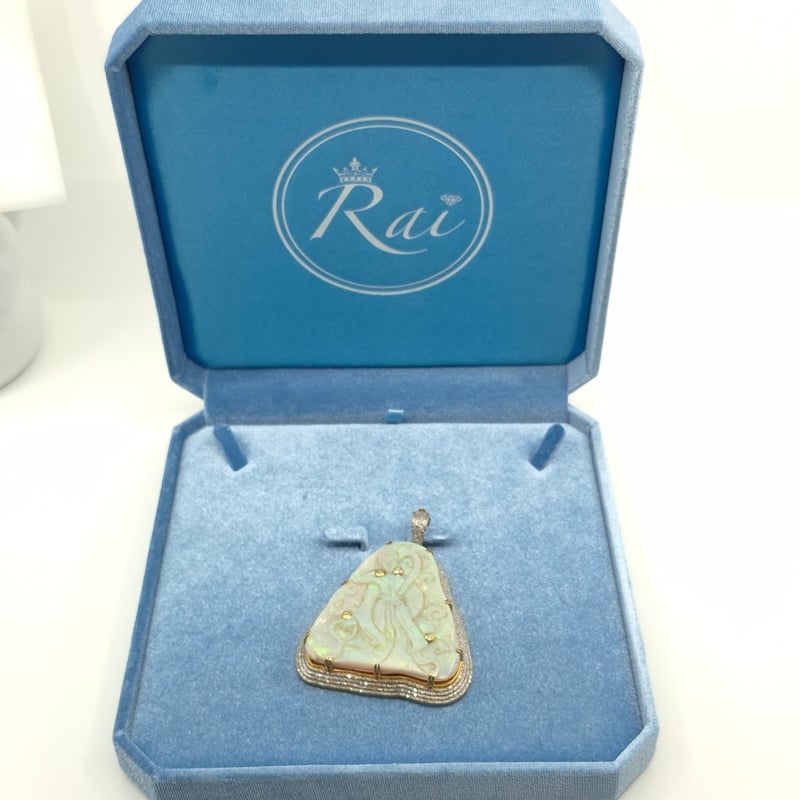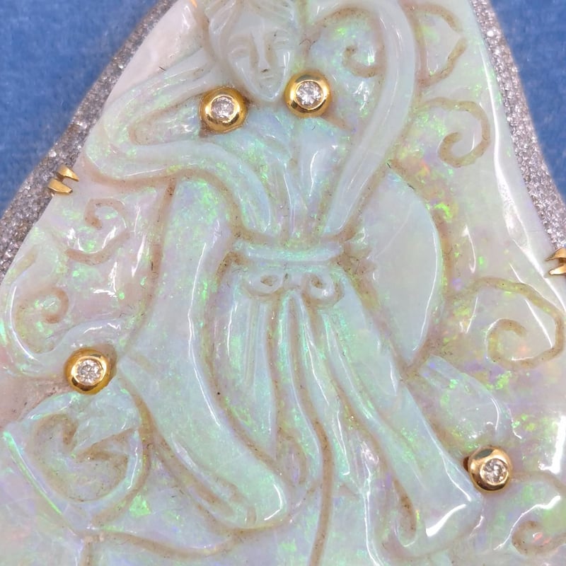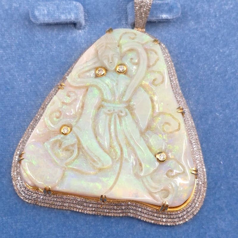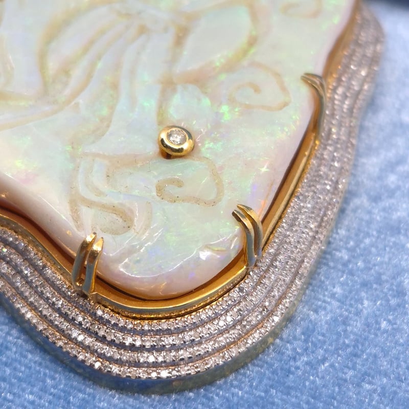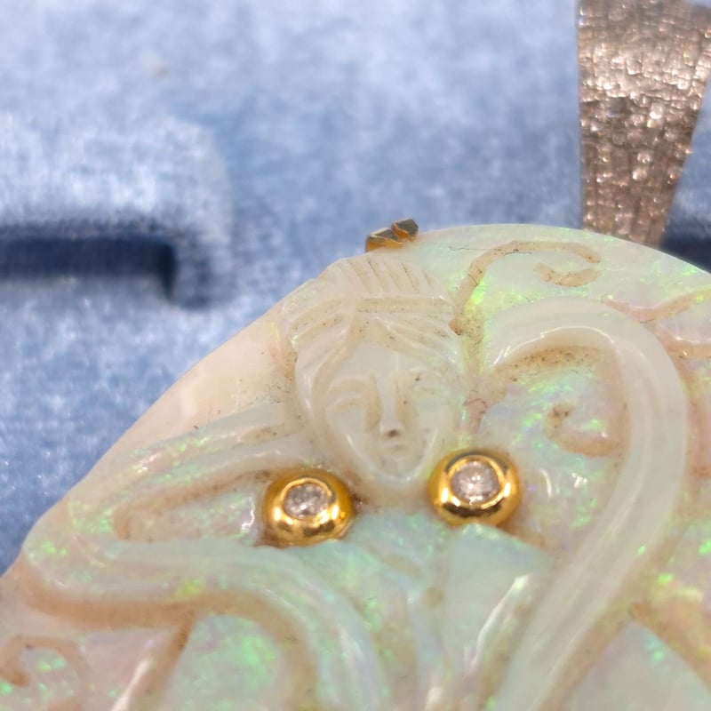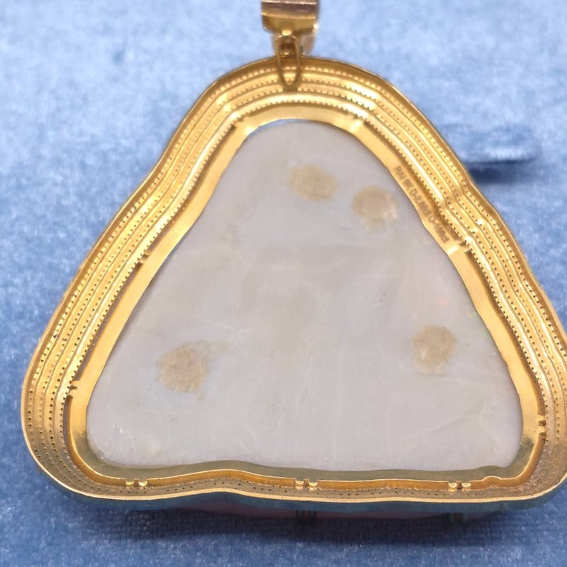 HANDCRAFTED 9CT YELLOW GOLD OPAL AND DIAMOND PENDANT. Measures 83.4Mm X 65.4Mm And Is Set With A 59.4Mm X 55.9Mm 193.00Ct Triangular Light Opal Which Has Been Hand Carved. The Opal Is Surrounded By Seven Hundred And Eighty (Approx.) Brilliant Cut Diamonds Colour "I" And Clarity "13" With A Total Diamond Weight Of 2.16Ct. The Pendant Is Stamped 9K And Weighs 60.9Gms. Total Item Weight: 60.90g Markings: 9K Condition: Good - Refer To Images This valuation has been conducted by an independent third-party professional. The valuation amount is an assessment by the issuing valuer and does not reflect the auction value of the item. Any inquiries regarding the valuation should be directed to the issuing valuer (refer to contact details on the certificate), as Lloyds Auctions has no affiliation or influence over the valuation, the valuer, or the stated amount. Insurance Replacement Valuation Amount: $35,625.00 586120+1