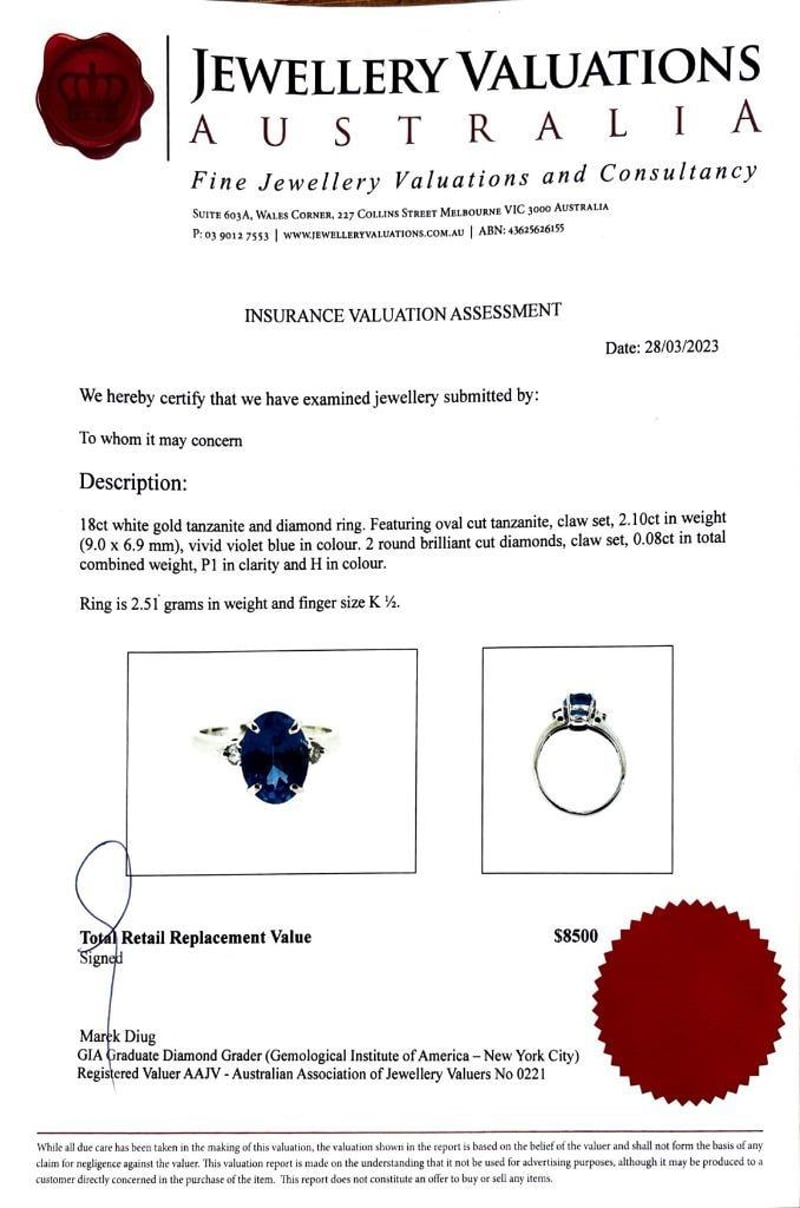 18KT WHITE GOLD TANZANITE AND DIAMOND RING Total Item Weight: 2.51gms Featuring Oval Cut Tanzanite, Claw Set, 2.10Ct In Weight (9.0 X 6.9 Mm), Vivid Violet Blue In Colour. 2 Round Brilliant Cut Diamonds, Claw Set, 0.08Ct In Total Combined Weight, P1 In Clarity And H In Colour. Finger Size K 2. Jewellery Valuations Provided By A Third Party Professional Not Directly Associated With Lloyds Auctions at AUD $8500This Insurance Valuation has been provided by a registered Jewellery Valuer and is intended for insurance purposes only. The valuation amount has no bearing on the auction value of the item. Any questions regarding the valuation should be directed to the issuing Valuer (refer to contact details on the certificate) as Lloyds have no association or relationship with the Valuer or the valuation amount contained within the valuation. Condition: Excellent- Refer Images 0162901+225CROSSDOCK