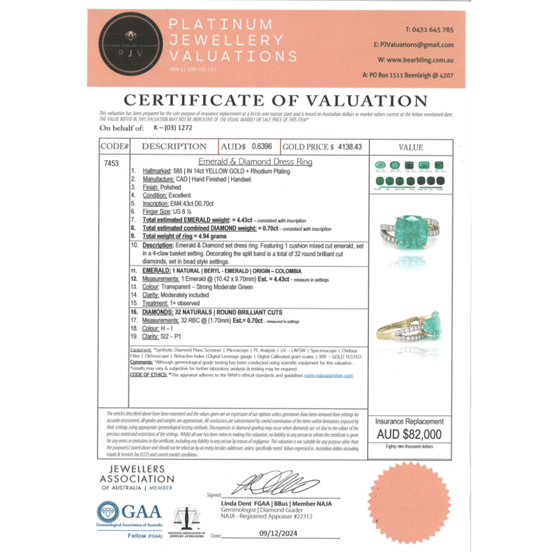 14K YELLOW GOLD, 4.43CT COLOMBIAN EMERALD AND DIAMOND, SPLIT BAND RING. The Centre Features, One Cushion Mixed Cut, Strong Moderate Green, Colombian Emerald (4.43Ct, Moderately Included), 4 Claw Set. Decorating The Split Band Are, 32 Round Brilliant Cut, Diamonds (0.70Ct Tdw, H-I Colour, Si2-P1 Clarity), Bead Set. Ring Size M. Valuations Provided by an Independent Third-Party Professional Not Directly Associated With Lloyds Auctions at AUD $$82,000.00This valuation has been conducted by an independent third-party professional. The valuation amount is an assessment by the issuing valuer and does not reflect the auction value of the item. Any inquiries regarding the valuation should be directed to the issuing valuer (refer to contact details on the certificate), as Lloyds Auctions has no affiliation or influence over the valuation, the valuer, or the stated amount. Condition: Good - Refer Images 0645844+5060
