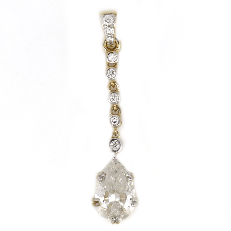 14K YELLOW GOLD AND DIAMOND, PENDANT. The Design Features, One Pear Cut, Diamond (1.02Ct, H Colour, Si2 Clarity), Double Claw Set. Accompanying The Drop Is, 8 Round Brilliant Cut Diamonds (0.073Ct, H-I Colour, Si-I2 Clarity), Pip/Bezel Set. Valuations Provided by an Independent Third-Party Professional Not Directly Associated With Lloyds Auctions at AUD $$19,500.00This valuation has been conducted by an independent third-party professional. The valuation amount is an assessment by the issuing valuer and does not reflect the auction value of the item. Any inquiries regarding the valuation should be directed to the issuing valuer (refer to contact details on the certificate), as Lloyds Auctions has no affiliation or influence over the valuation, the valuer, or the stated amount. Condition: Good - Refer Images 0645844+5031