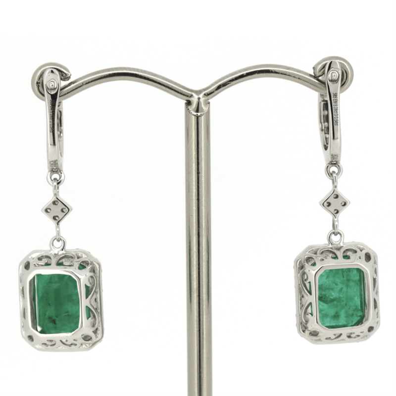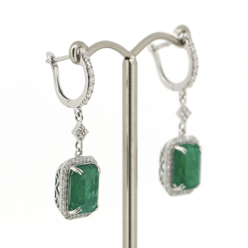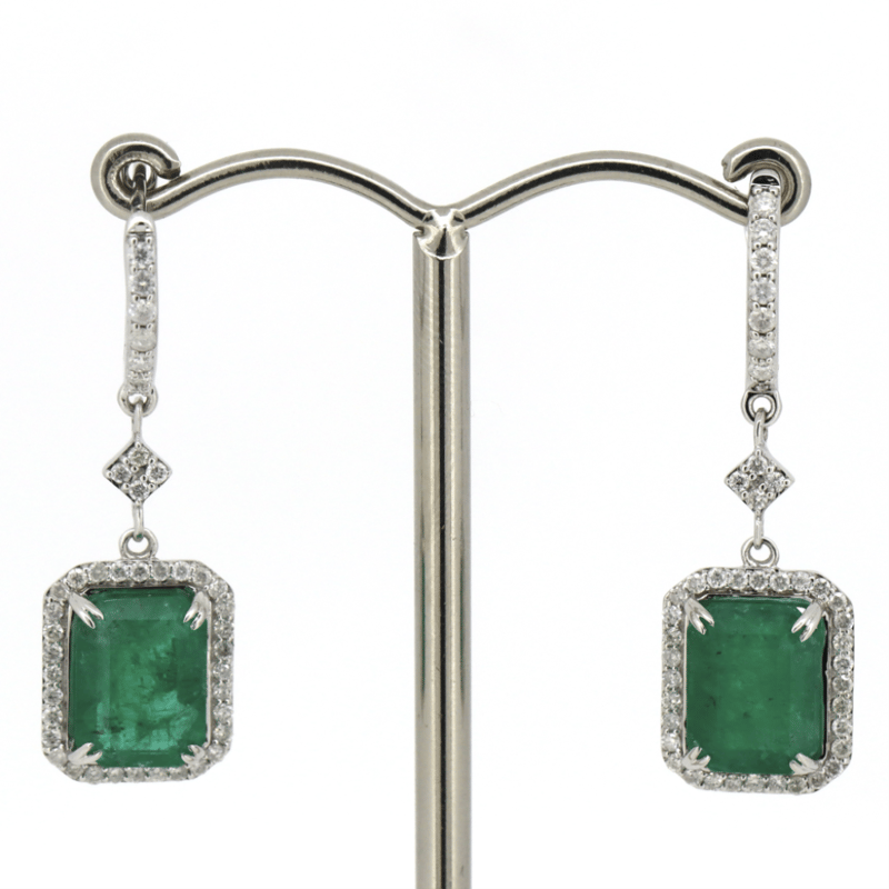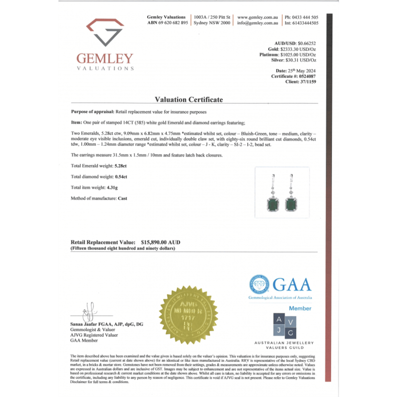 14K WHITE GOLD, EMERALD AND DIAMOND, HALO DROP EARRINGS. The Design Features, 2 Emerald Cut, Dark Moderate Green, Emeralds (5.28Ct Tsw, Moderate Eye Inclusions), Claw Set. Surrounding The Stones Are, 86 Round Brilliant Cut, Diamonds (0.54Ct Tdw, J-K Colour, Si2-I2 Clarity), Claw Setting. The Earrings Have Hoop Hinged Closures. Valuations Provided by an Independent Third-Party Professional Not Directly Associated With Lloyds Auctions at AUD $$15,890.00This valuation has been conducted by an independent third-party professional. The valuation amount is an assessment by the issuing valuer and does not reflect the auction value of the item. Any inquiries regarding the valuation should be directed to the issuing valuer (refer to contact details on the certificate), as Lloyds Auctions has no affiliation or influence over the valuation, the valuer, or the stated amount. Condition: Good - Refer Images 0645844+5059