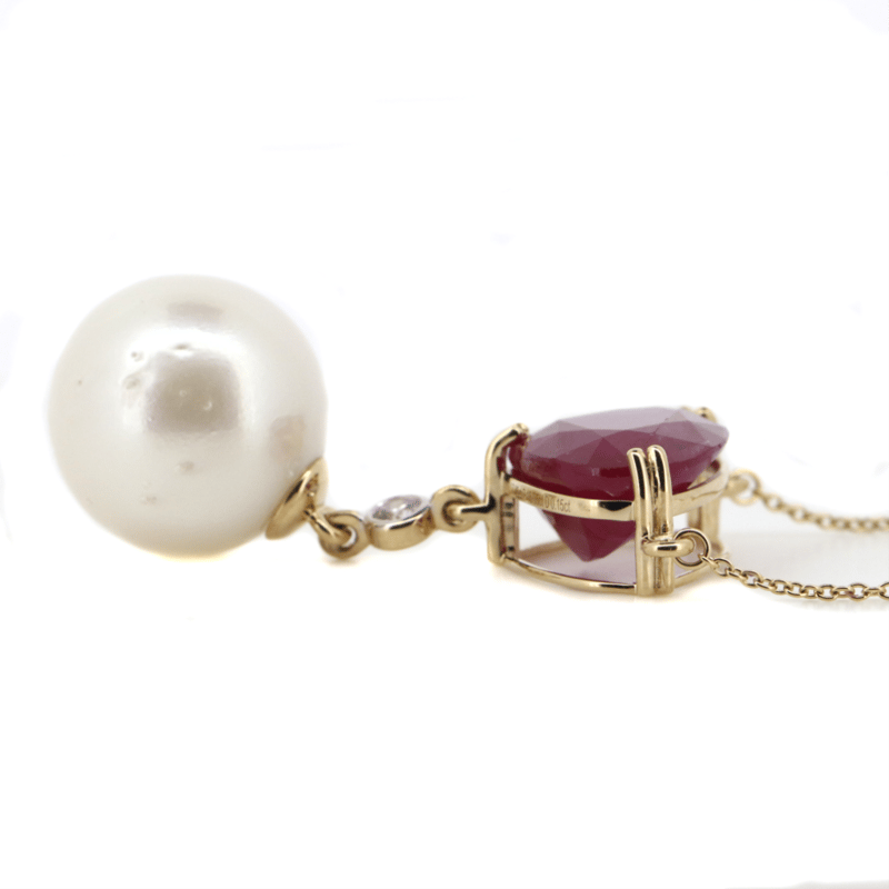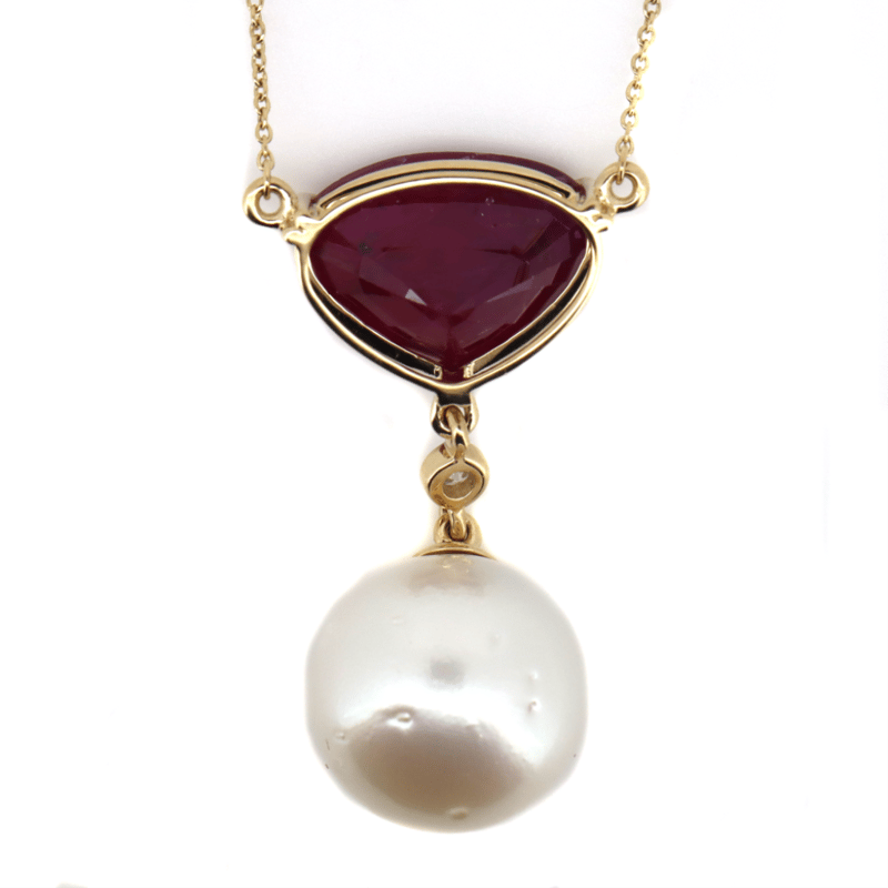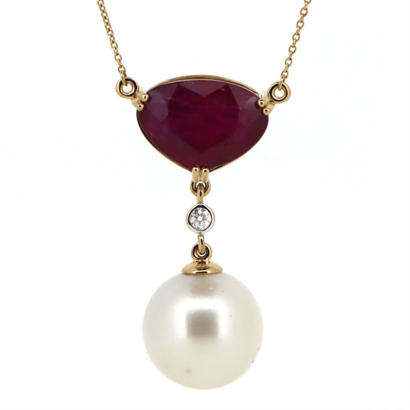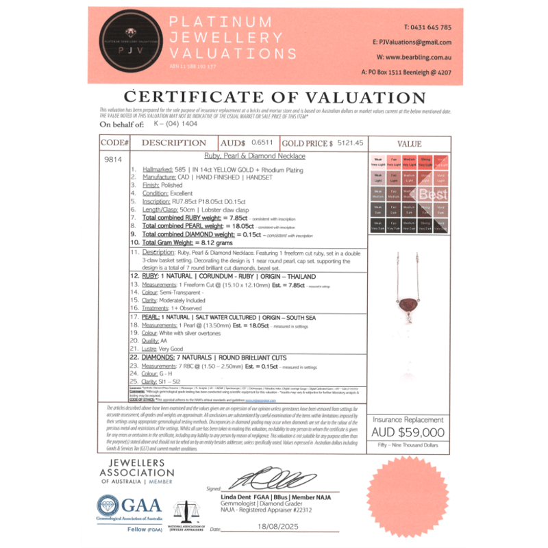 14K YELLOW GOLD, WHITE CULTURED SOUTH SEA PEARL, RUBY AND DIAMOND, NECKLACE. The Design Features, One Near Round, White With Silver Overtones Cultured Pearl (18.05Ct, 13.50Mm, Very Good Lustre), Cap Set. Encompassing The Design Is, One Free Form Cut, Deep Red, Ruby (7.85Ct, Moderately Included), Double Claw Set. Supporting The Design Is, 7 Round Brilliant Cut, Diamonds (0.15Ct Tdw, G-H Colour, Si1-Si2 Clarity), In Bezel Setting. The Necklace Features A Lobster Claw Clasp And Is 50Cm In Length. Valuations Provided by an Independent Third-Party Professional Not Directly Associated With Lloyds Auctions at AUD $$59,000.00This valuation has been conducted by an independent third-party professional. The valuation amount is an assessment by the issuing valuer and does not reflect the auction value of the item. Any inquiries regarding the valuation should be directed to the issuing valuer (refer to contact details on the certificate), as Lloyds Auctions has no affiliation or influence over the valuation, the valuer, or the stated amount. Condition: Good - Refer Images 0645844+5035