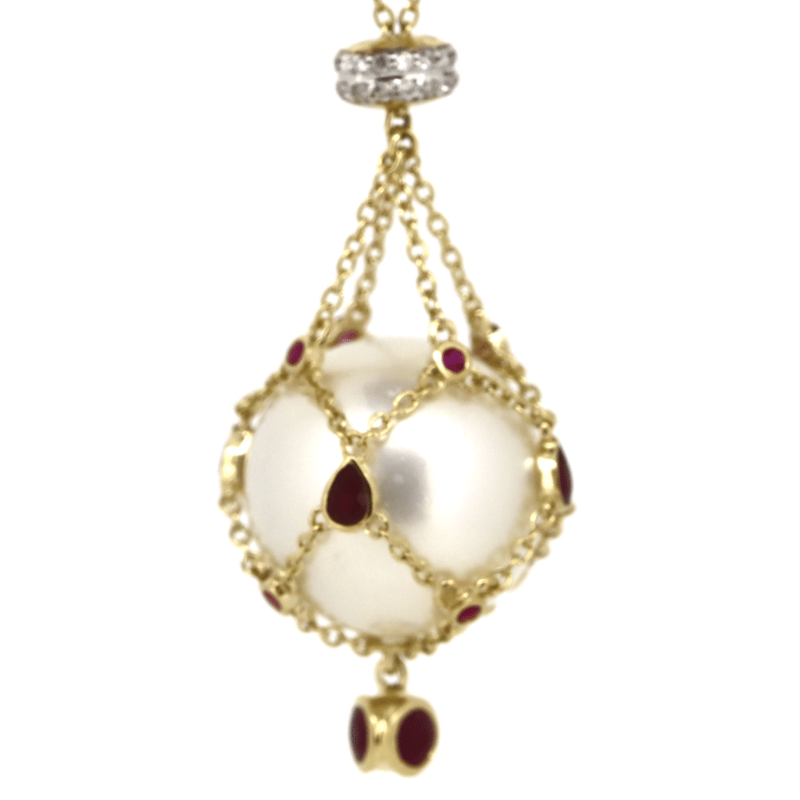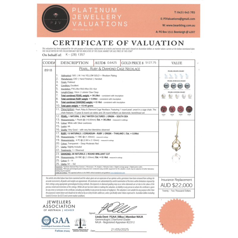14K YELLOW GOLD, WHITE CULTURED SOUTH SEA PEARL, RUBY AND DIAMOND, CAGE NECKLACE. The Design Features One Round, White Cultured South Sea Pearl (30.28Ct/16.20Mm Size, Natural Growth Marks), Unset In A "Cage" Chain. The Chain Features, 15 Pear/Round Cut, Red Rubies (0.99Ct Tsw, Slightly Included) And 28 Round Brilliant Cut, Diamonds (0.16Ct Tdw, G-H Colour, Si1-Si2 Clarity), Bezel/Bead Set. The Necklace Features A Lobster Claw Clasp Closure. Necklace Length Is 18Cm. Valuations Provided by an Independent Third-Party Professional Not Directly Associated With Lloyds Auctions at AUD $$22,000.00 This valuation has been conducted by an independent third-party professional. The valuation amount is an assessment by the issuing valuer and does not reflect the auction value of the item. Any inquiries regarding the valuation should be directed to the issuing valuer (refer to contact details on the certificate), as Lloyds Auctions has no affiliation or influence over the valuation, the valuer, or the stated amount. Condition: Good - Refer Images 0 645844+5015