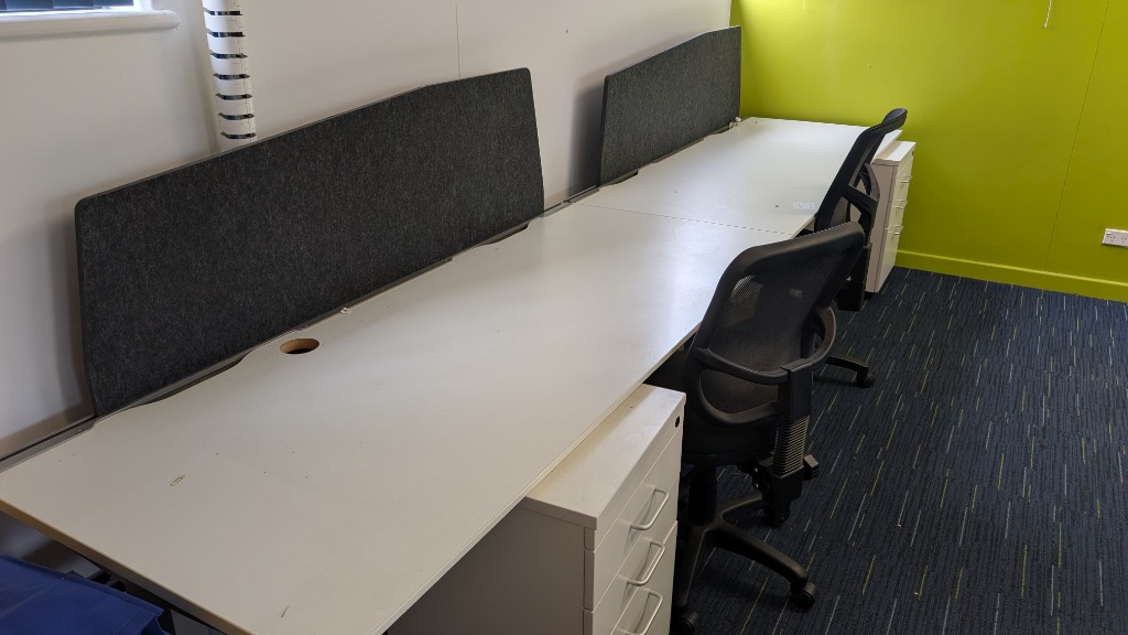 Office Desk workstation, 2-person workstation, includes chairs, dividers and rolling drawer units.