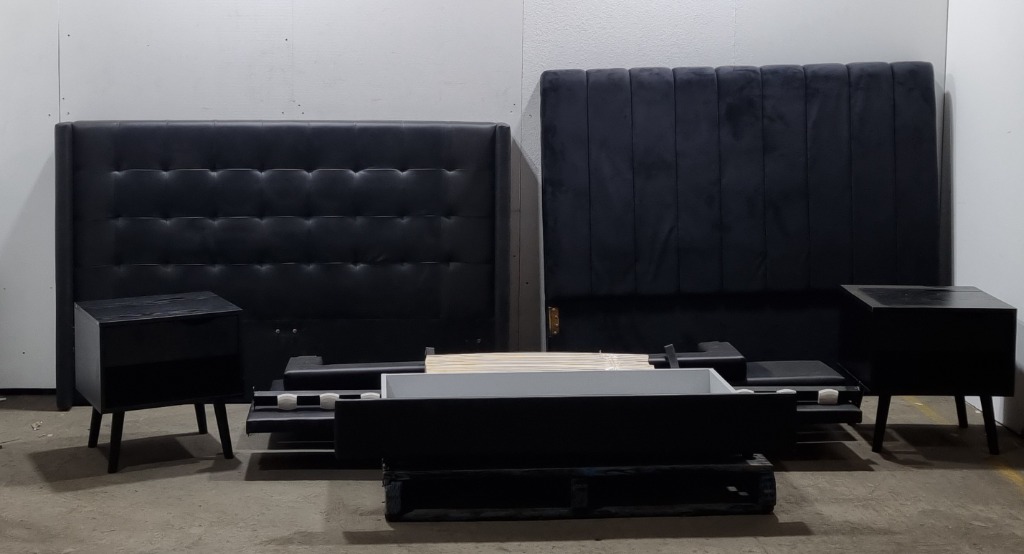 Bedroom lot . Includes black double bed, leather upholstery with slats, 2 x side tables with charging connections and 1 x extra velvet headboard. No fixtures included. Sold as lot .