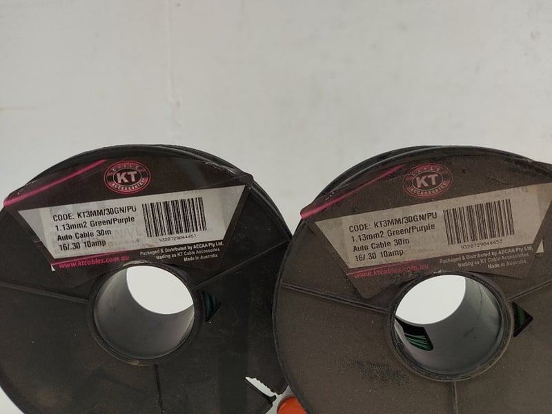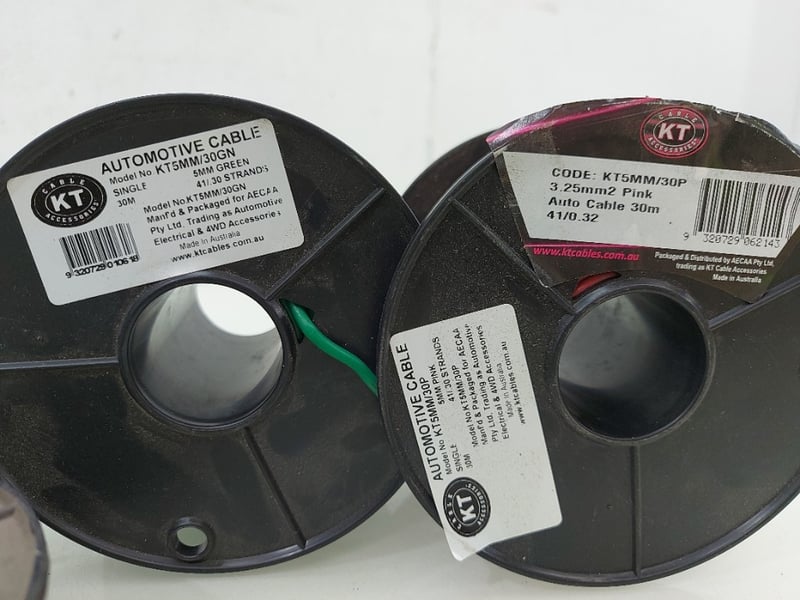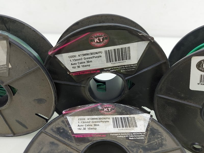 Automotive Cable, KT Cable Accessories, 1.13mm2 Green/Purple, 30M, 16/.30, ×4, Code: KT3MM/30GN/PU, Single 5MM Green, 30m, 41/.30 Strands, Model KT5MM/30, 3.25MM2 Pink, 30M, 41/0.32, Quantity 6Sold As Lot