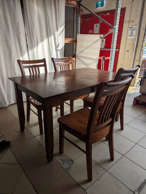 Dining suite, timber, table and 4 chairsNote: general wear and tear Dimensions table: H 77cm x W 142cm x D 85cmDimensions chairs: H 95cm x W 45cm x D 50cm SOLD AS LOT