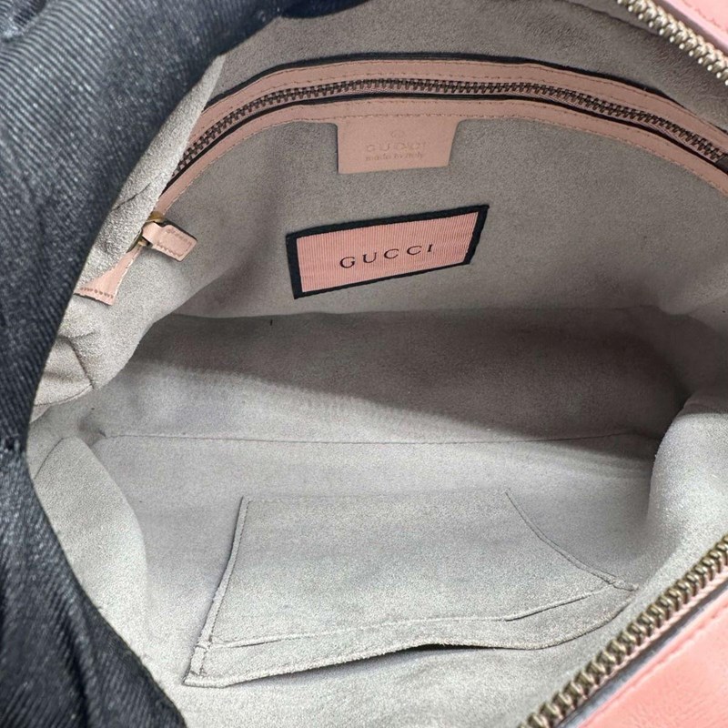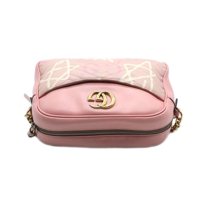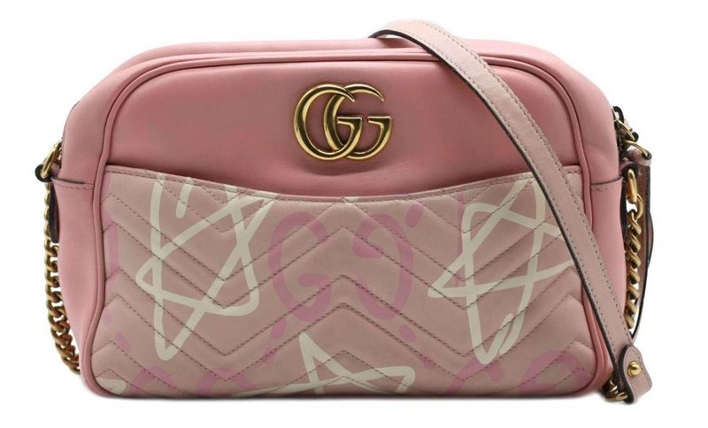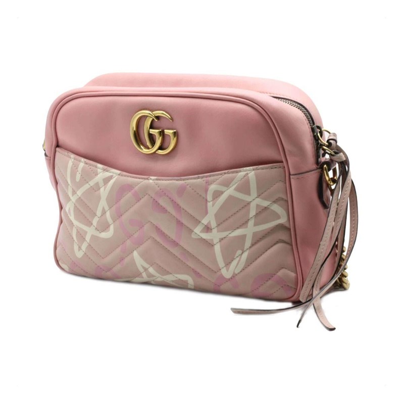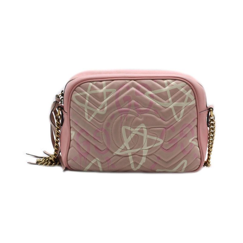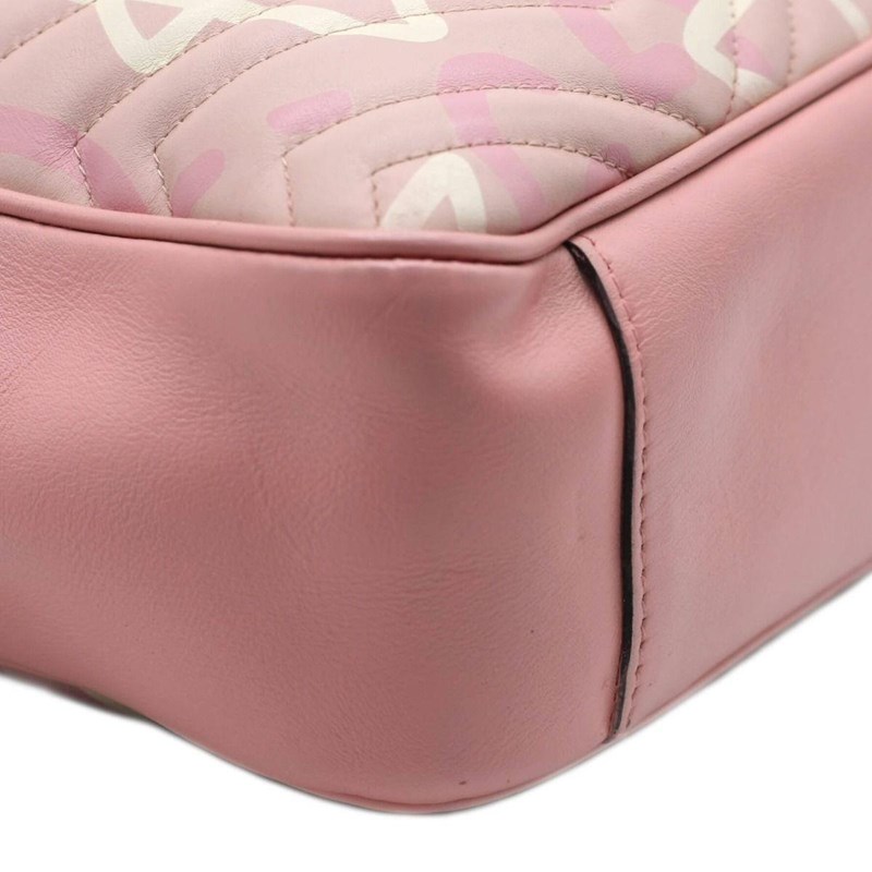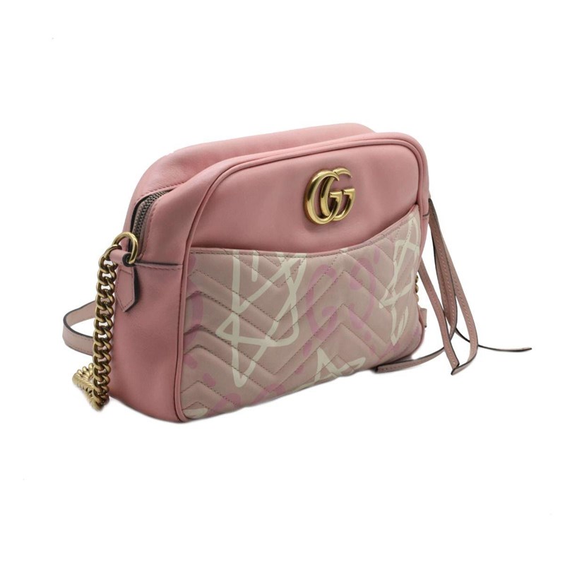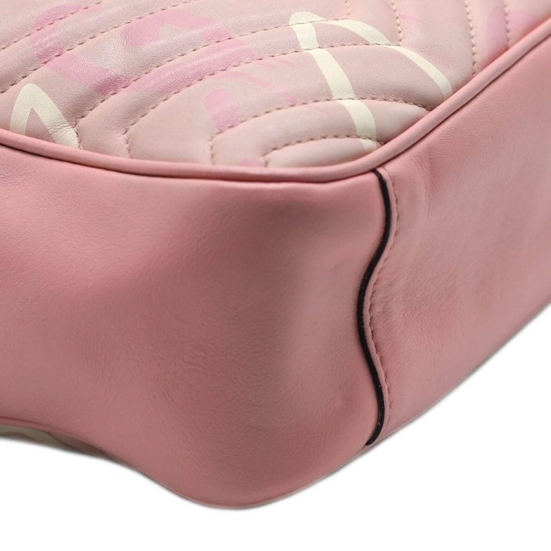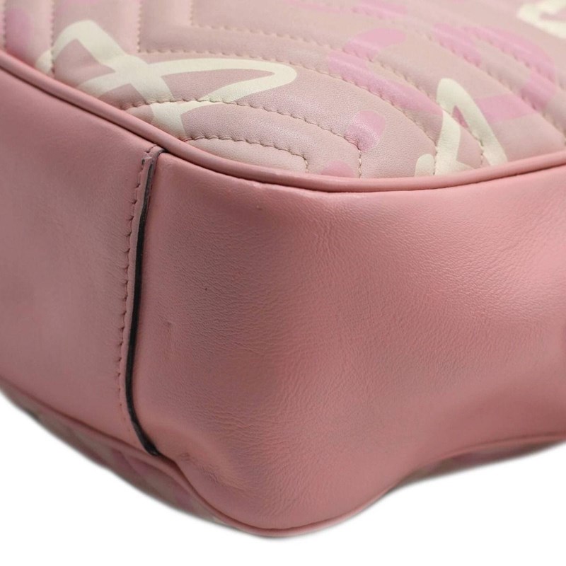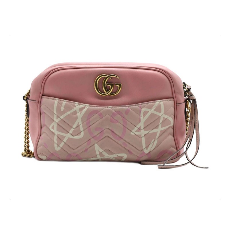 GUCCI PINK GUCCIGHOST PRINT MEDIUM GG MARMONT SHOULDER BAG The bag features the graffiti art by street artist Trouble Andrew, an aged gold chain shoulder strap with a leather handle, long leather tassel zipper pulls and an aged gold interlocking GG logo. Length: 26cm Height: 20cm Depth: 7.5cm Strap Drop: 47cm Exterior Material Leather with gold-tone hardware, a front patch pocket, zip around closure and a shoulder strap. Interior Material Suede lining with a main compartment, a zipped pocket and two patch pockets. Additional Condition Report - Moderate sign of wear on exterior - Minor scuffs on exterior corners - The interior is clean with sign of wear - Modearte scratches on hardware Comes With - Original Dustbag - Certificate of Authenticity CROSSED DOCKED 155307+41