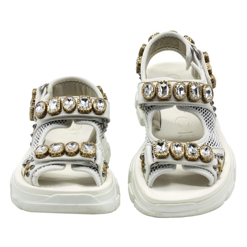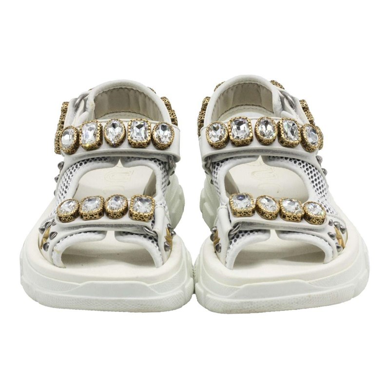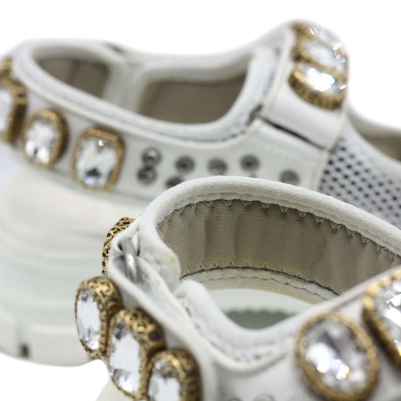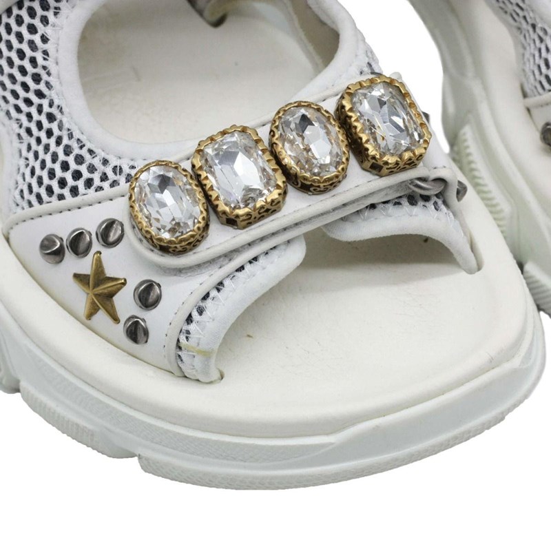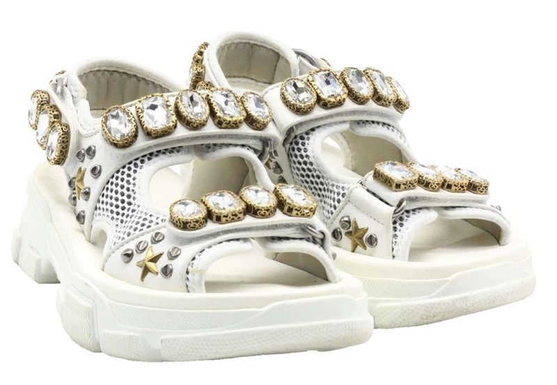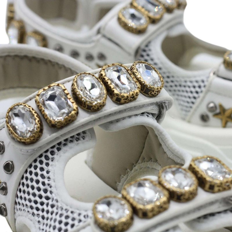 They are crafted using white mesh and leather, with crystal embellishments perched on the upper straps.