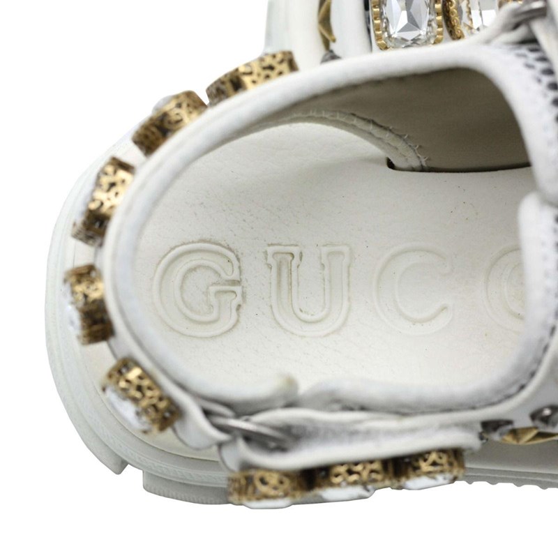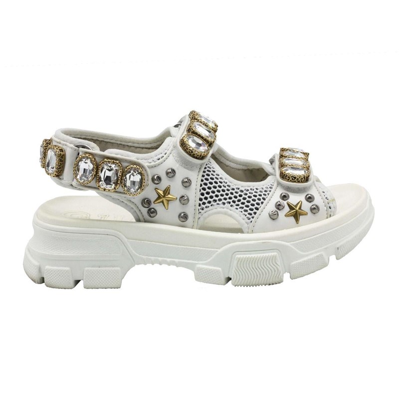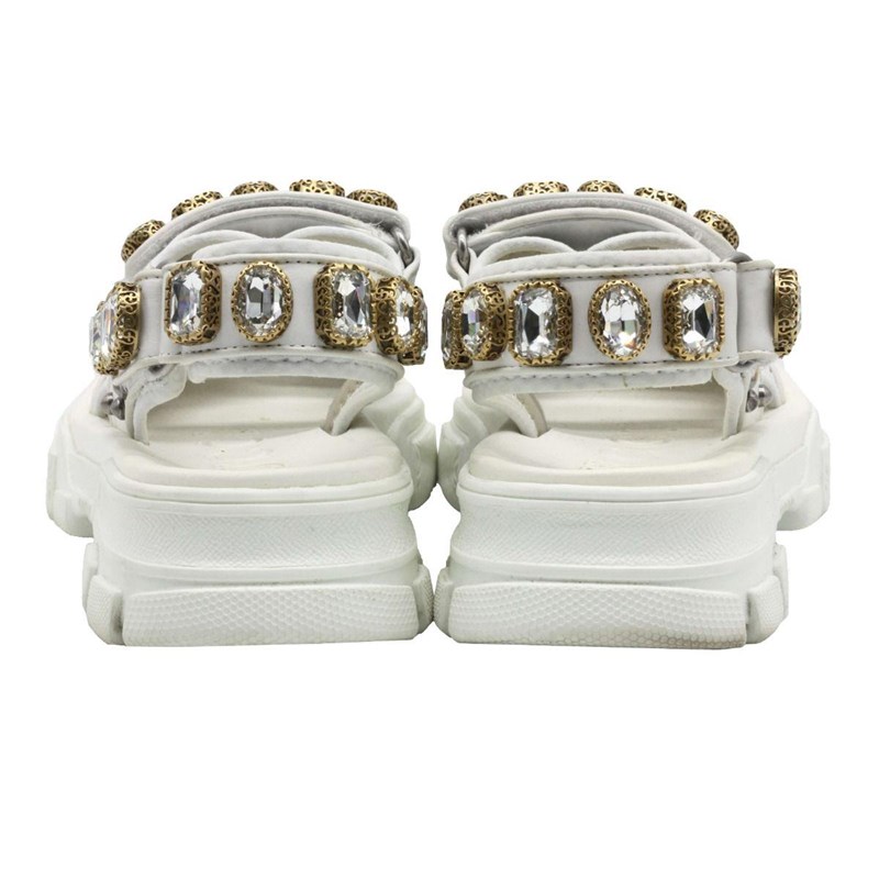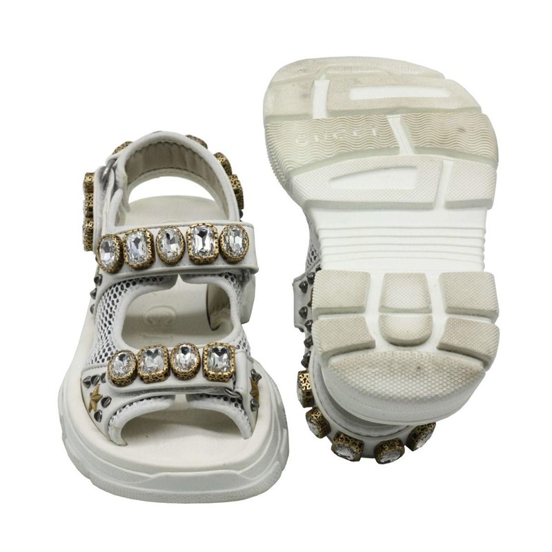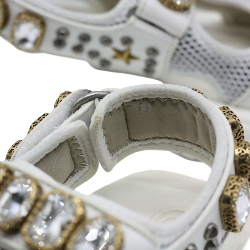 They are crafted using white mesh and leather, with crystal embellishments perched on the upper straps.