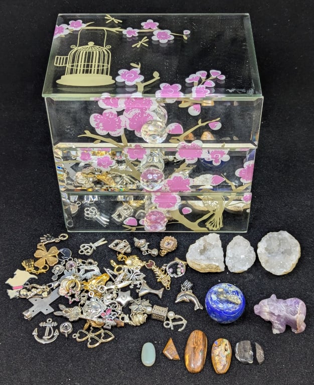 JEWELLERY BOX WITH COLLECTION OF CHARMS, CRYSTAL GEODE, PRECIOUS STONE FIGURES INCLUDING APPLE AND BEAR, 71TCW ROUGH OPALS584892+154