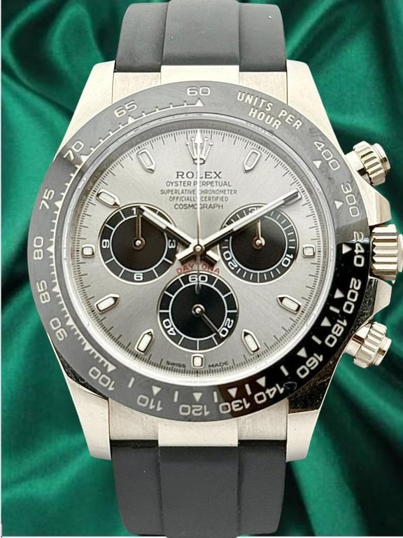 ROLEX DAYTONA GHOST CERAMIC & WHITE GOLD 116519LN | 2022 | 40MMBrand : RolexReference : 116519LnModel : Daytona GhostYear : 2022Condition : MintCase Size : 40MmPower Reserve : 72HDial : GreyBezel : CeramicCase : White GoldBracelet : RubberPapers : YesBox : Yes488259+17