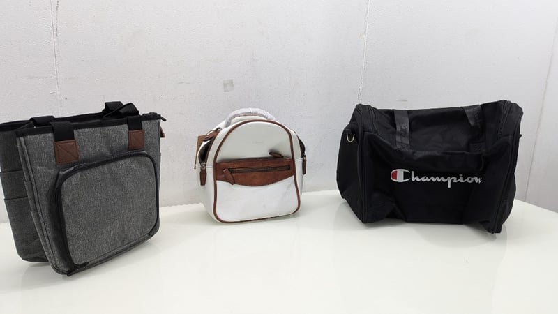 Assorted Bags, Includes Ravuo Mini Back Pack, Champion Duffle Bag, Insulated Carrier, Quantity 3Sold As Lot