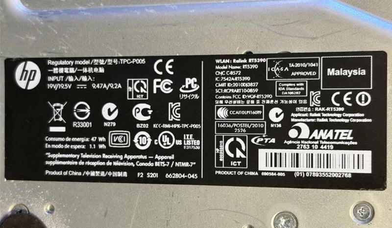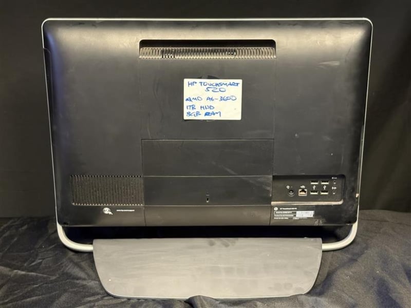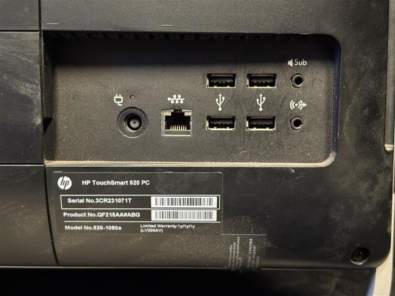 HP TouchSmart 520-1080a All-in-One PC Serial No: 3CR231071T Product No: QF215AA#ABG Beats Audio integration, AMD A6-3650 processor, 1TB HDD, 8GB RAM, touchscreen display. Ports include Ethernet, 4x USB, audio jacks, and power input. Note: Item is Untested, No Power Cord Available.