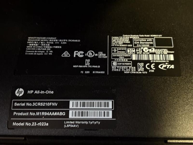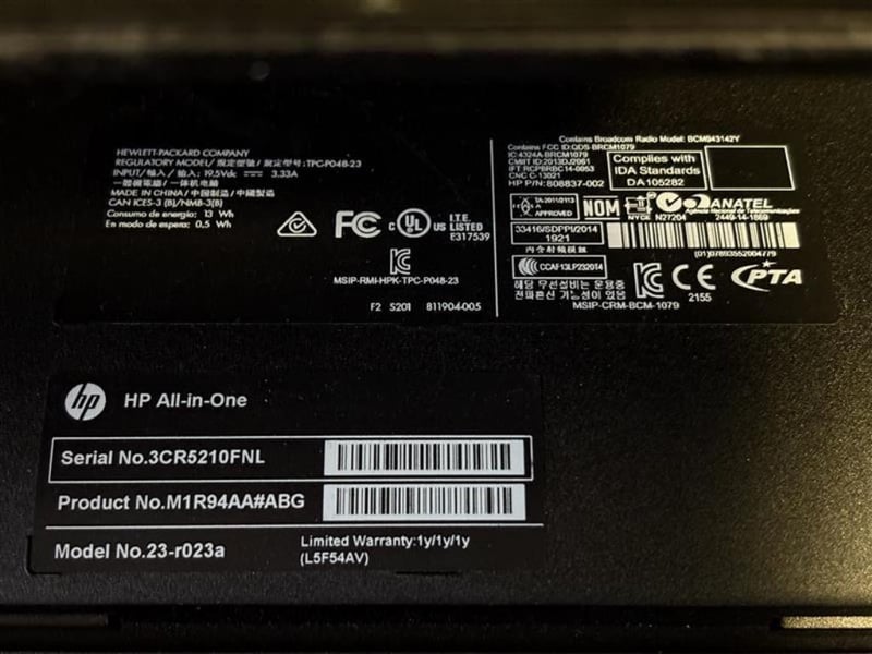 HP All-in-One 23-r023a PCs (x2) Serial Nos: 3CR5210FNV & 3CR5210FNL Product No: M1R94AA#ABG Condition: Both units noted as “Won’t Power On – For Parts.” Includes: Integrated stand, Ethernet, HDMI, and 3x USB ports. Suitable for parts.