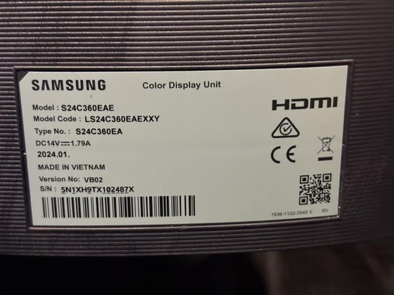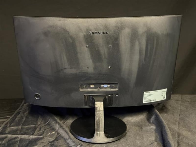 Samsung 24" Curved Monitor – Model S24C360EAE Model Code: LS24C360EAEXXY Serial No: 5N1XH9TYK102487X Features: HDMI and VGA inputs, 24V DC power, sleek curved display, made in Vietnam (2024). Includes: Power and display cables, keyboard, and mouse. Condition: Powers on, display functional.