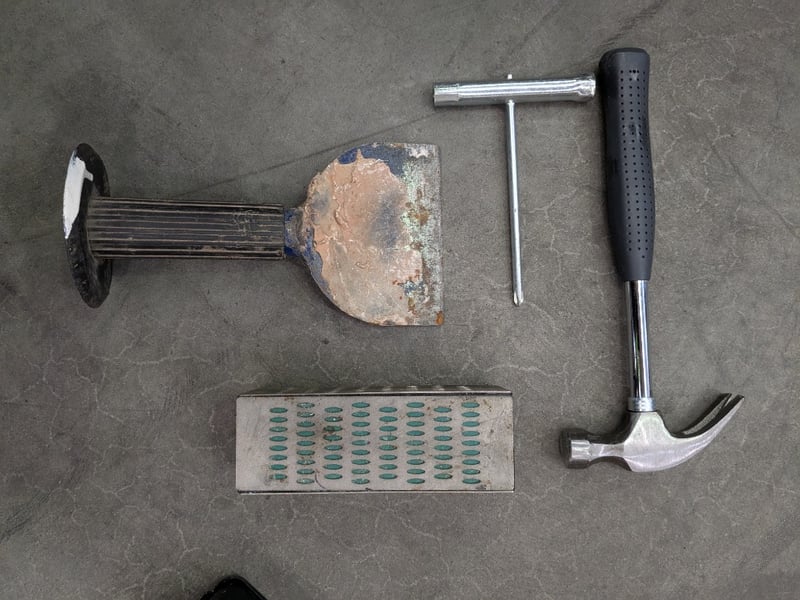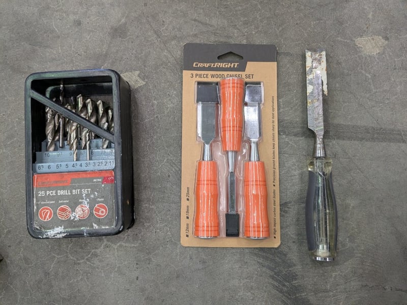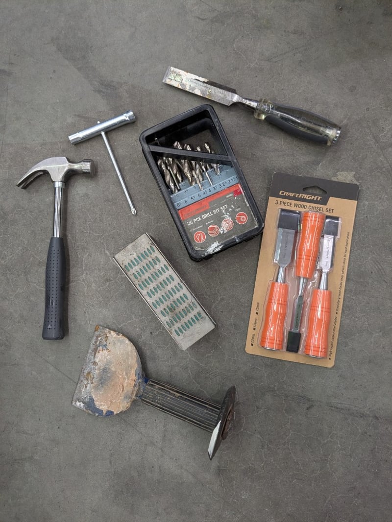 Assorted lot of tools including hammer, chisels, diamond knife sharpener and drill bits.
