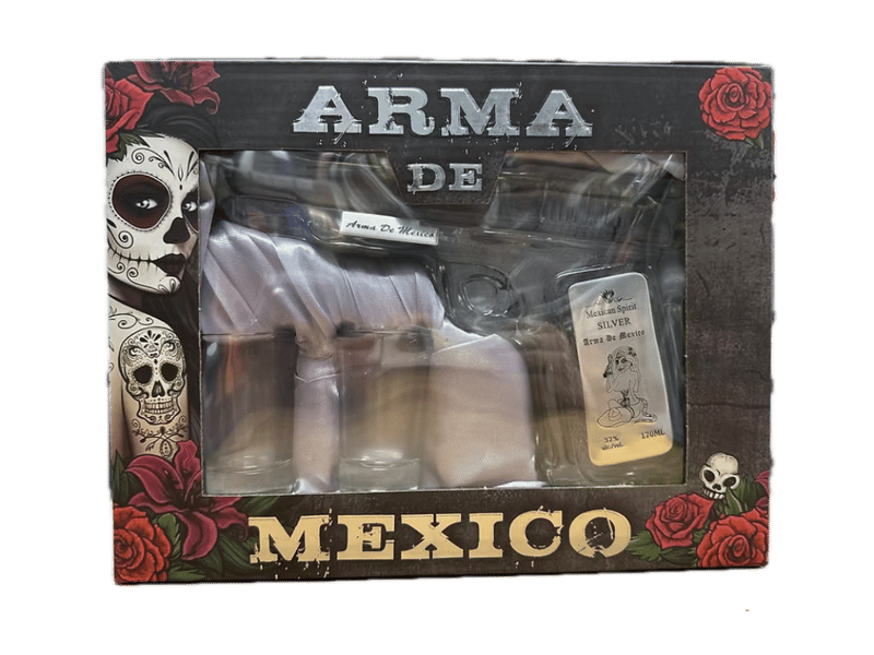 Arma De Mexico Silver 170ml Pistol Pack Limited Edition Discover the ARMA DE MEXICO HAND GUN SILVER, perfect for any occasion. The pistol bottle resembles a real-life Glock gun and is nestled inside the gift box along with the 2 shot glasses. Elevate your gatherings with this one-of-a-kind tequila experience, embodying luxury and uniqueness. Makes for a perfect gift!