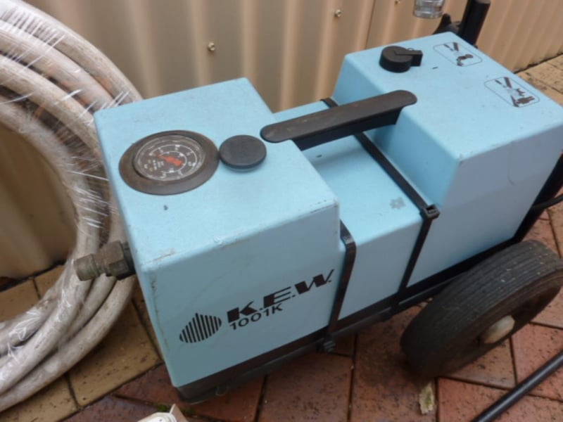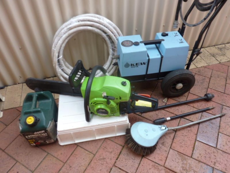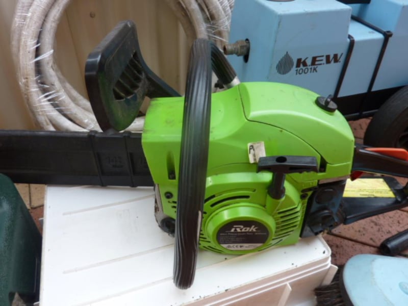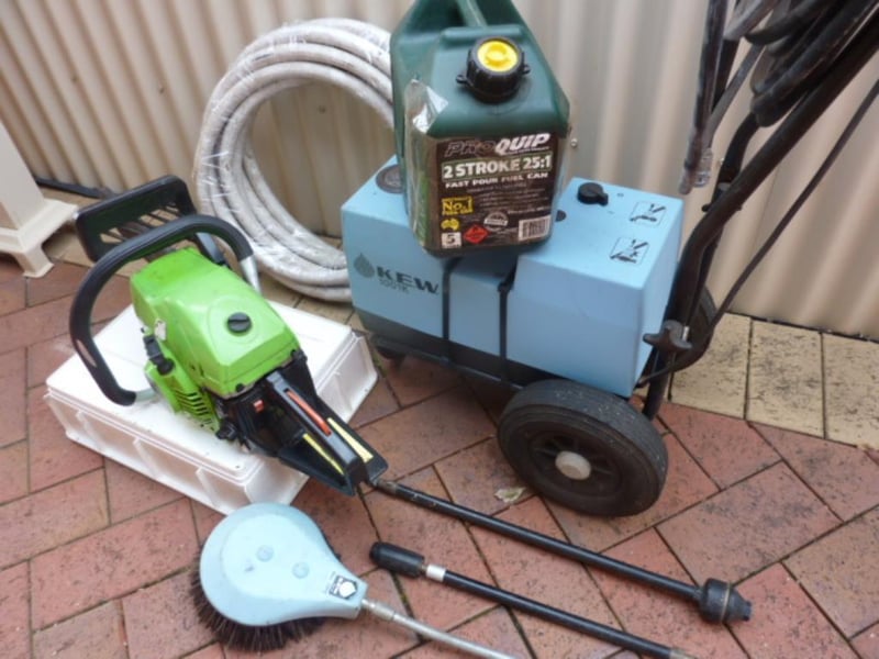 Pressure cleaner , Kew brand with hose and attachments . Rok 45cc chainsaw & fuel container .