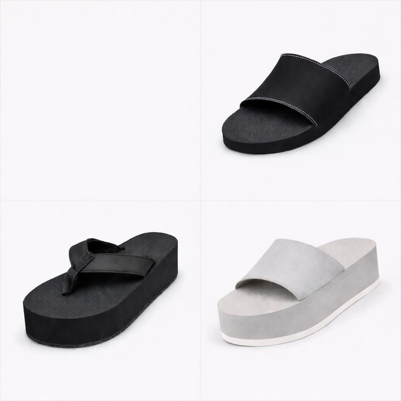 INDOSOLE WOMENS US 10/11 - EURO 41/42 - DECK OUT YOUR SUMMER STYLE WITH THIS INDOSOLE WOMENS 3 PAIR COMBO. 1 X SLIDE BLACK/BLACK CONTRAST STITCH + 1 X PLATFORM THONGS BLACK + 1 X PLATFORM SLIDE SNEAKER SOLE SEA SALT/SEA SALT SOLE
