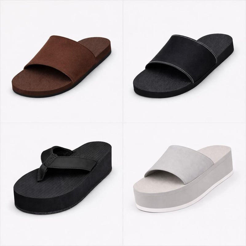 INDOSOLE WOMENS US 6/7 - EURO 37/38 - DECK OUT YOUR SUMMER STYLE WITH THIS INDOSOLE WOMENS 4 PAIR COMBO. 1 X SLIDE SOIL + 1 X SLIDE BLACK/BLACK CONTRAST STITCH + 1 X PLATFORM THONGS BLACK + 1 X PLATFORM SLIDE SNEAKER SOLE SEA SALT/SEA SALT SOLE