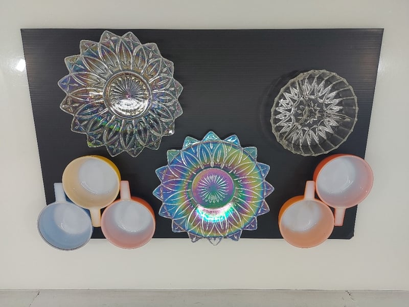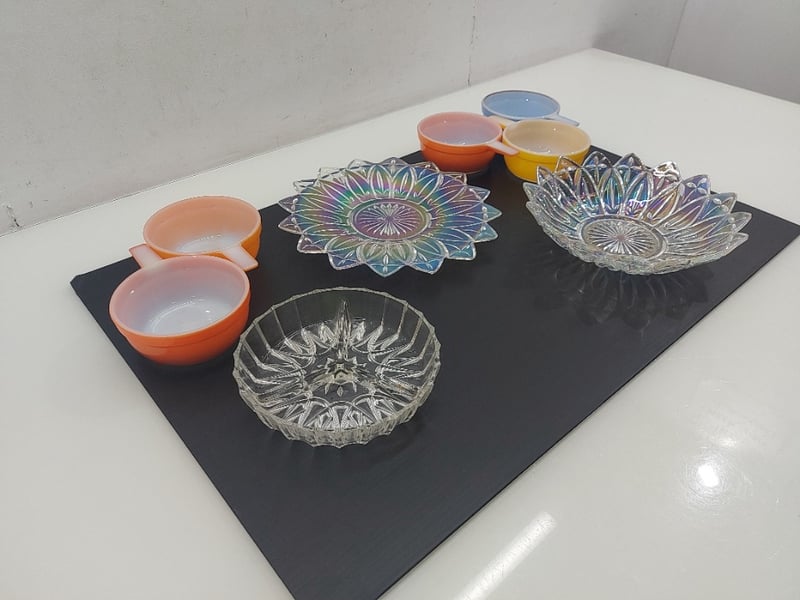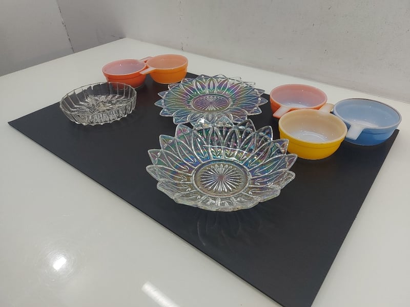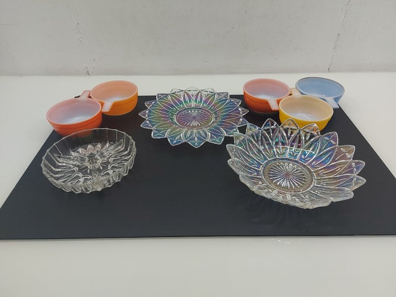 Assorted Glass Lot Includes, Crown Ovenware, Transparent Rainbow Glass Dishes, 3 Section Glass Dish, Quantity 8Sold As Lot
