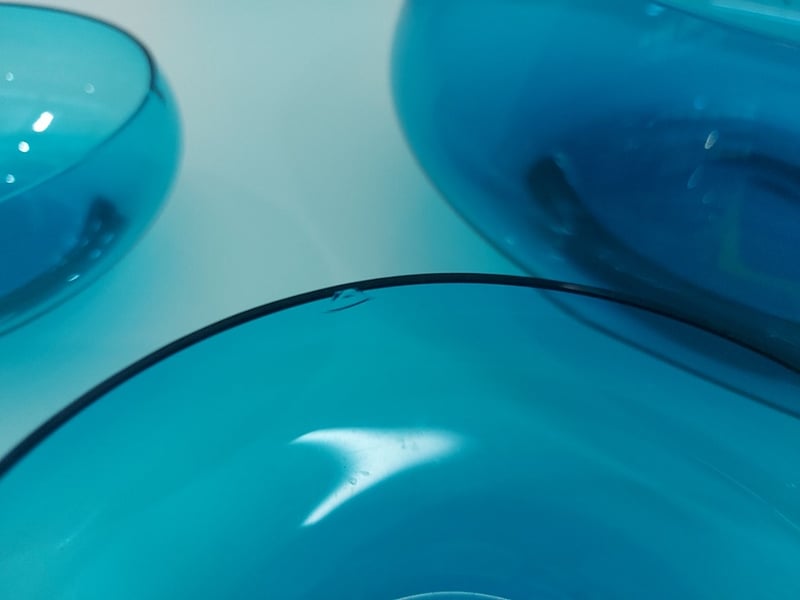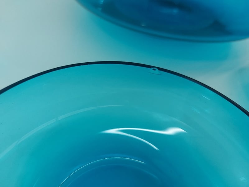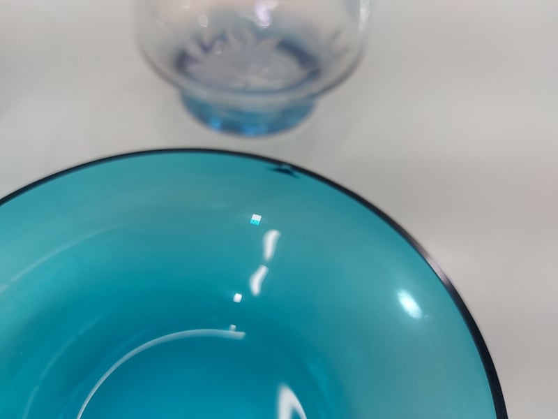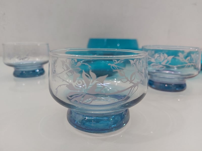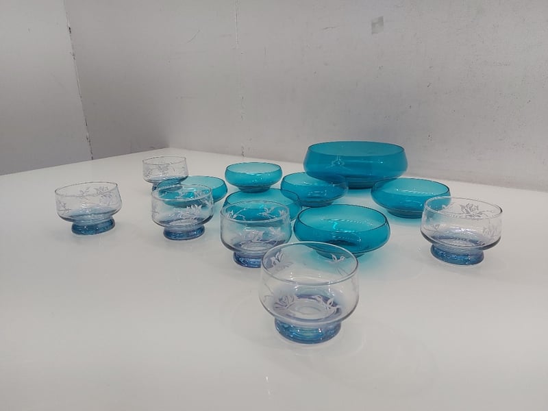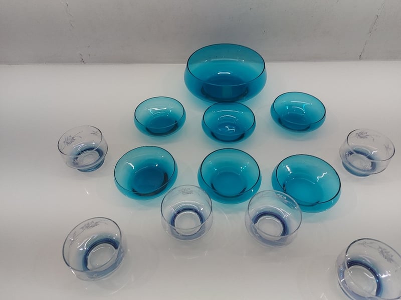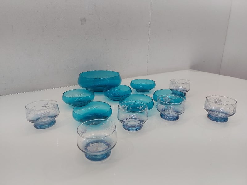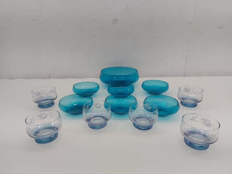 Glassware Lot, Includes Blue Glass Bowl Set, Glass Bowls With Coloured Glass And Flower Design, Quantity 13Sold As Lot