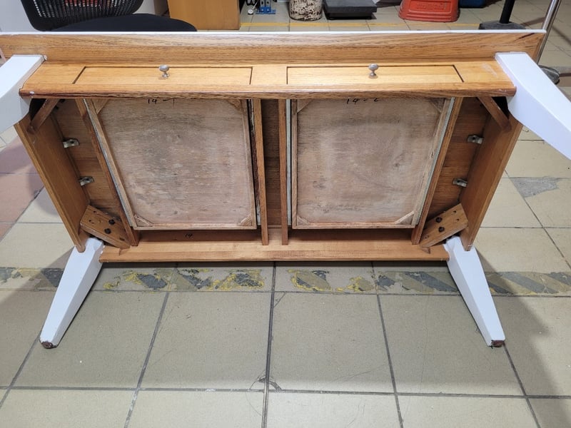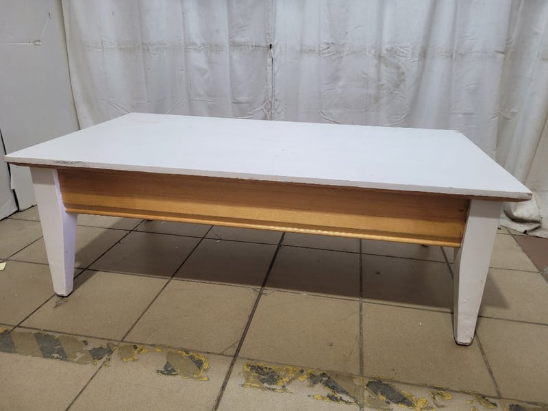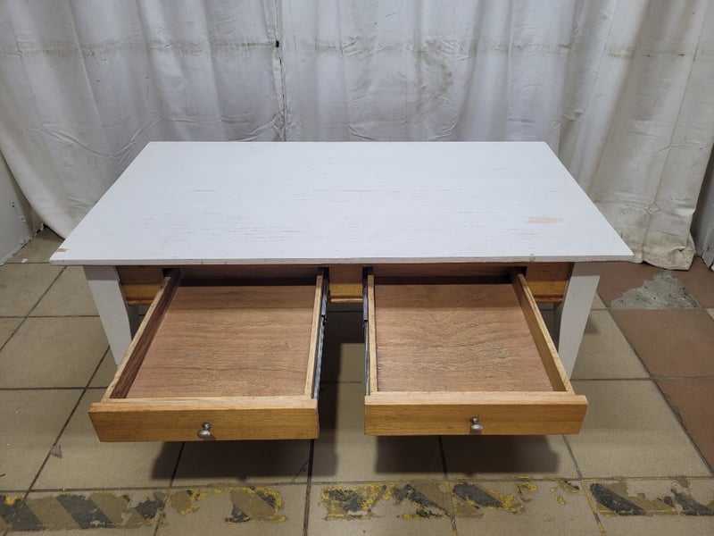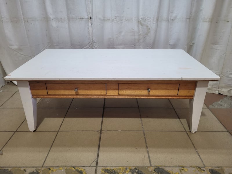 Coffee Table, White/Brown Timber Finish, 2 DrawersDimensions: H: 46cm W: 70cm D: 130cm
