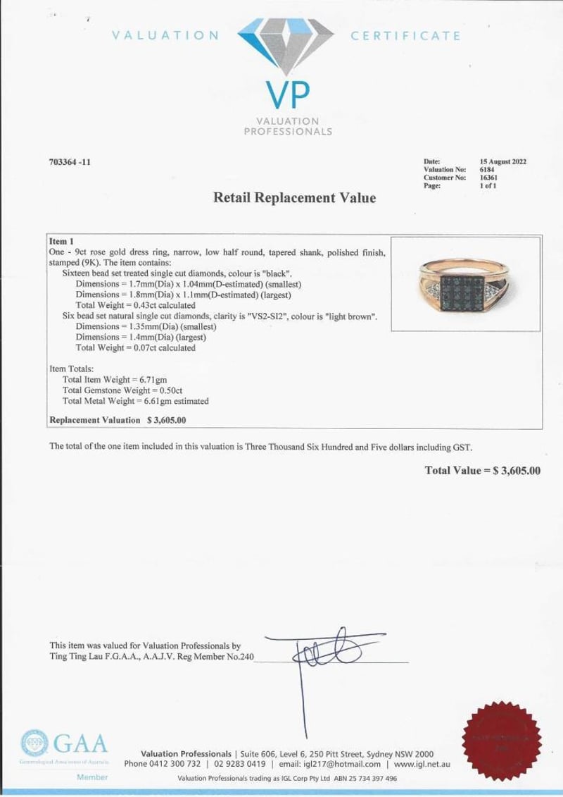 9K YELLOW GOLD 0.50 CARAT GENTS DIAMOND RING 16 Black Diamond = 0.43 Carats 6 Brilliant Natural Diamond = 0.07 Carat Ring Weight = 6.77 Grams Finger Size T ( Size 10 ) Valuations Provided by an Independent Third-Party Professional Not Directly Associated With Lloyds Auctions at AUD $3605 This valuation has been conducted by an independent third-party professional. The valuation amount is an assessment by the issuing valuer and does not reflect the auction value of the item. Any inquiries regarding the valuation should be directed to the issuing valuer (refer to contact details on the certificate), as Lloyds Auctions has no affiliation or influence over the valuation, the valuer, or the stated amount. Condition: Good - Refer Images 0 488962+6