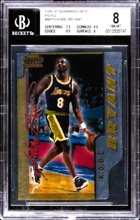 1996 BOWMAN'S BEST PICKS DIE CUT ROOKIE KOBE BRYANT #BP10 – BGS 8 NM-MT A Premier Die-Cut Rookie Card From Kobe Bryant’S Inaugural Nba Season – Authenticated By Bgs Nba BasketballOverview:This Listing Presents The 1996 Bowman'S Best Picks Die Cut Rookie Kobe Bryant #Bp10, Graded Bgs 8 (Near Mint-Mint), An Eye-Catching And Highly Collectable Rookie-Year Issue Of The Late Lakers Legend. The Card Belongs To The Prestigious Bowman'S Best Product Line, Renowned For Its Chromium-Style Finish And Ambitious Design Concepts, And Features One Of The Earliest And Most Distinctive Rookie Cards Of Kobe Bryant. Issued In The Year He Was Drafted Straight From Lower Merion High School Into The Nba, This Die-Cut Card Has Earned Status As A Flagship Chase Piece For Collectors Of 1990S Basketball Icons.Key Features:The Card Utilises A Complex Die-Cut Silhouette And Features A Refractive Foil Surface With A Layered Background, Showcasing Kobe In His Draft-Day Attire. The Reverse Side Provides Insight Into His High School Dominance And Nba Prospects, Placing The Card Firmly Within His Transition Narrative From Prodigy To Professional. While The Bgs 8 Grade Reflects Light Wear Consistent With The Grade, The Card Retains Strong Visual Presentation, With Sharp Contrast, Clean Die-Cut Edges, And Vibrant Printing That Typifies The Bowman'S Best Aesthetic Of The Mid-1990S.Why This Card Is Collectable:Die-Cut Rookie Issues Of Hall Of Famers, Particularly From Limited Or Insert Subsets, Remain Amongst The Most Actively Pursued By Seasoned Collectors. This Particular Kobe Bryant Card Is Part Of The "Best Picks" Insert Subset, Designed To Spotlight Players Viewed As Future Stars — A Prediction Kobe Emphatically Fulfilled. With His 1996 Rookie Cards Continuing To Appreciate In Relevance And Value, Especially Following His Induction Into The Hall Of Fame And The Continued Global Admiration Of His Legacy, This Card Offers Both Historical And Investment Appeal. The Bgs Encapsulation Ensures Authenticity And Condition Assurance, Reinforcing Its Place In Any Serious Basketball Card Portfolio.Collector Appeal:This Is A Must-Have For Collectors Of Kobe Bryant’S Rookie Material, Especially Those Assembling 1996 Insert Runs Or Seeking Visually Striking Alternatives To Standard Rookie Issues. It Holds Strong Appeal As A Centrepiece Card For Display Purposes, While Also Offering Long-Term Appreciation Potential Owing To Its Combination Of Rarity, Design Intricacy, And The Subject’S Enduring Stature In Global Sport. The Bgs 8 Grade Provides A Balanced Entry Point For Investors And Collectors Alike Who Value Encapsulated Authenticity With Solid Eye Appeal.584885+2