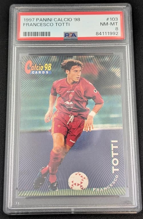 1997 PANINI CALICO #103 FRANCESCO TOTTI PSA NM-MT 8 Cert Number - 84111992 Item Grade - NM-MT 8 Label Type: PSA Reverse Cert/Barcode - YES Year - 1997 Brand/Title - PANINI CALICO Subject - FRANCESCO TOTTI Card Number - #103 Category - FOOTBALL CARD