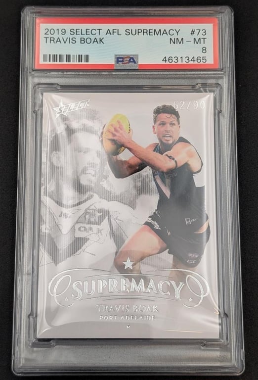 2019 SELECT AFL SUPREMACY #73 TRAVIS BOAK INFLUENTIAL PSA NM-MT 9 Cert Number - 46313465 Item Grade - NM-MT 9 Label Type: PSA Reverse Cert/Barcode - YES Year - 2019 Brand/Title - SELECT AFL SUPREMACY Subject - TRAVIS BOAK Card Number - #73 Category - AFL CARD
