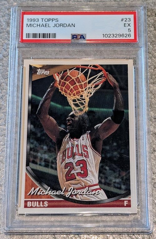 1993 TOPPS #23 MICHAEL JORDAN PSA EX 5 Cert Number - 102329626 Item Grade - EX 5 Label Type PSA Fugitive Ink Technology w/ Fugitive Ink Technology Reverse Cert/Barcode - Yes Year - 1993 Brand/Title - TOPPS Subject - MICHAEL JORDAN Card Number - #23 Category - BASKETBALL Cards