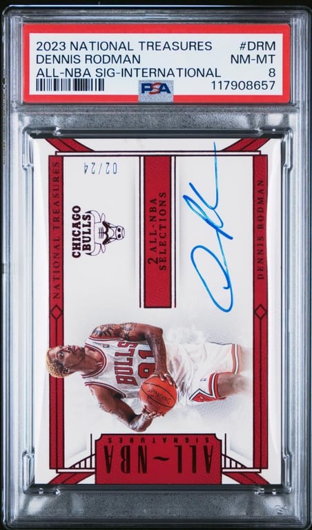 2023 PANINI NATIONAL TREASURES ALL-NBA SIGNATURES #DRM DENNIS RODMAN ALL-NBA SIG-INTERNATIONAL PSA NM-MT 8 Cert Number - 117908657 Item Grade - NM-MT 8 Label Type: PSA w/ Fugitive Ink Technology Reverse Cert/Barcode - Yes Year - 2023 Brand/Title - PANINI NATIONAL TREASURES ALL-NBA SIGNATURES Subject - DENNIS RODMAN Card Number - #DRM Category - BASKETBALL Cards Variety/Pedigree - ALL-NBA SIG-INTERNATIONAL