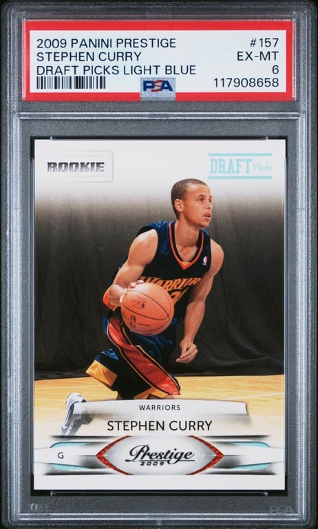 2009 PANINI PRESTIGE #157 STEPHEN CURRY DRAFT PICKS LIGHT BLUE PSA EX-MT 6 Cert Number - 117908658 Item Grade - EX-MT 6 Label Type: PSA w/ Fugitive Ink Technology Reverse Cert/Barcode - Yes Year - 2009 Brand/Title - PANINI PRESTIGE Subject - STEPHEN CURRY Card Number - #157 Category - BASKETBALL Cards Variety/Pedigree - DRAFT PICKS LIGHT BLUE