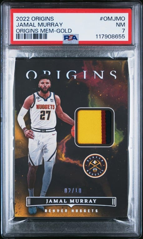 2022 PANINI ORIGINS ORIGINS MEMORABILIA #OMJMO JAMAL MURRAY ORIGINS MEM-GOLD PSA NM 7 Cert Number - 117908655 Item Grade - NM 7 Label Type: PSA w/ Fugitive Ink Technology Reverse Cert/Barcode - Yes Year - 2022 Brand/Title - PANINI ORIGINS Subject - JAMAL MURRAY Card Number - #OMJMO Category - BASKETBALL Cards Variety/Pedigree - ORIGINS MEM-GOLD