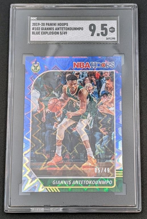 2019-20 PANINI HOOPS #102 GIANNIS ANTETOKOUNMPO BLUE EXPLOSION SGC MT+ 9.5 Cert Number - 3691390 Item Grade - MT+ 9.5 Label Type: SGC Reverse Cert/Barcode - Yes Year - 2019-20 Brand/Title - PANINI HOOPS Subject - GIANNIS ANTETOKOUNMPO Card Number - #102 Category - BASKETBALL Cards Variety/Pedigree - BLUE EXPLOSION