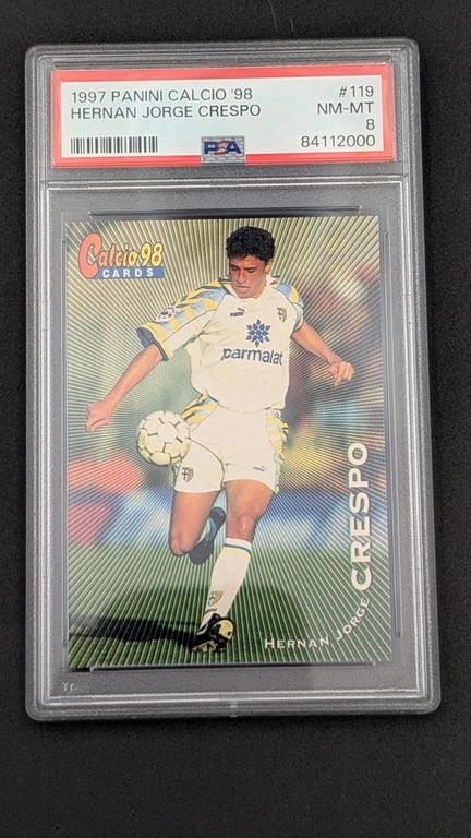1997 PANINI CALCIO '98 #119 HERNAN JORGE CRESPO PSA NM-MT 8 Cert Number - 84112000 Item Grade - NM-MT 8 Label Type: PSA w/ Fugitive Ink Technology Reverse Cert/Barcode - Yes Year - 1997 Brand/Title - PANINI CALCIO '98 Subject - HERNAN JORGE CRESPO Card Number - #119 Category - FOOTBALL Cards